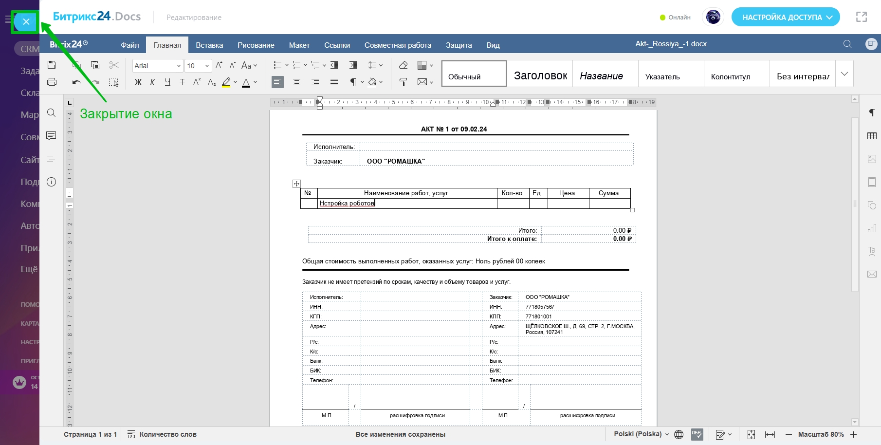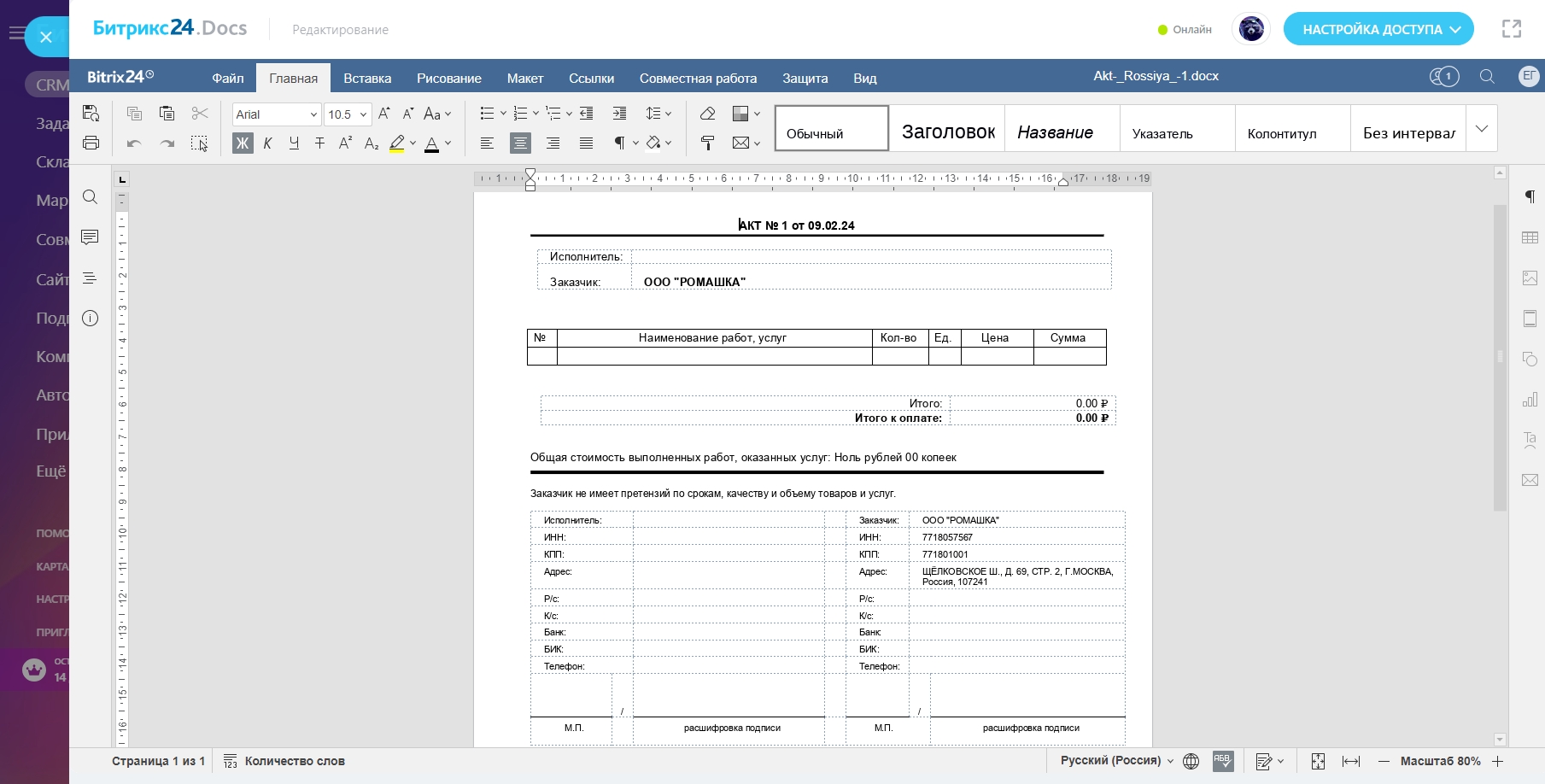 - Документ откроется для редактирования во встроенном редакторе Битрикс24