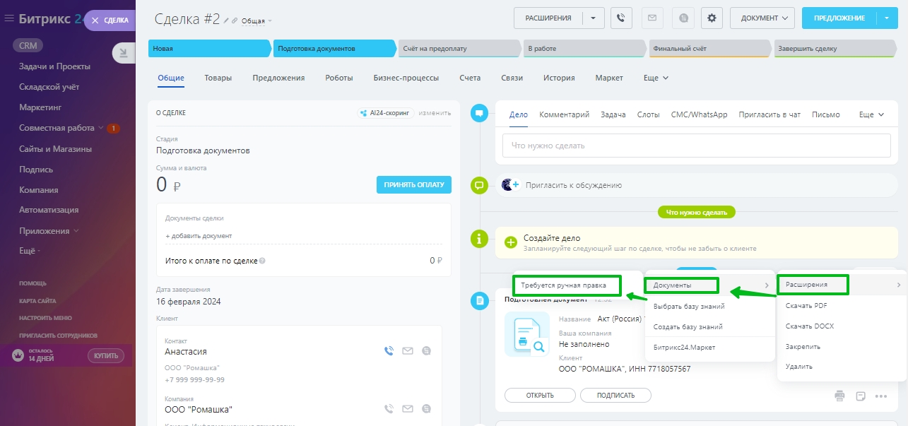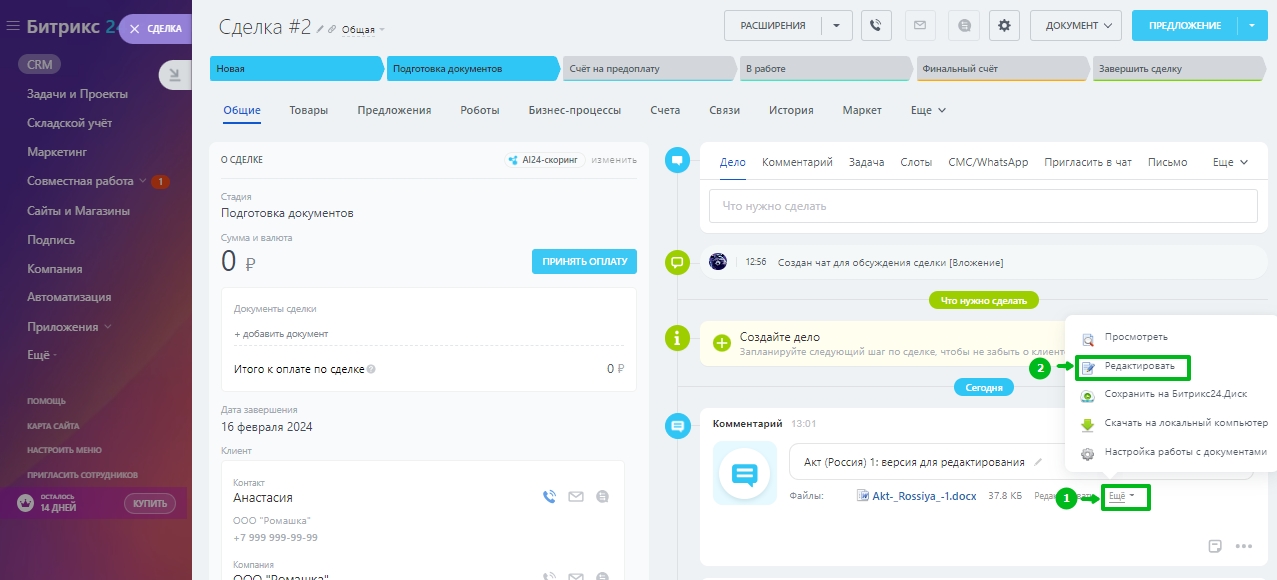 Создали документ в сделке по шаблону и хотите внести в него ручные правки, при этом все исправления, в том числе финальная версия, должны сохраниться в сделке?