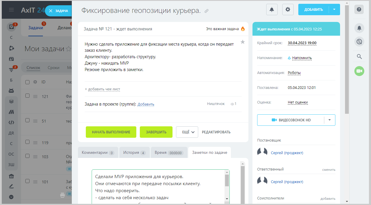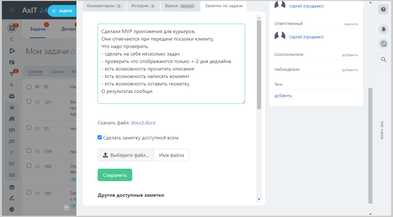 Поэтому, в ходе выполнения задачи, вы можете оставлять заметки по этой задаче, не делая заметку доступной всем, все ваши заметки останутся только у вас.