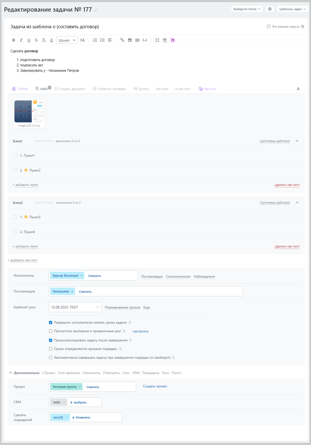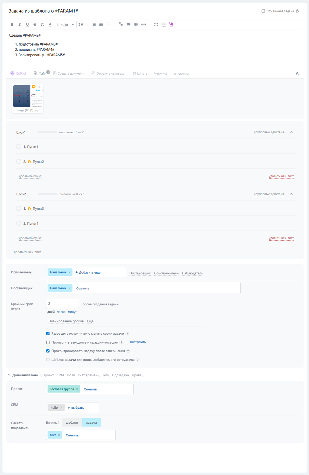 - параметры задачи "Разрешить исполнителю менять сроки задачи" и "Проконтролировать задачу после завершения"