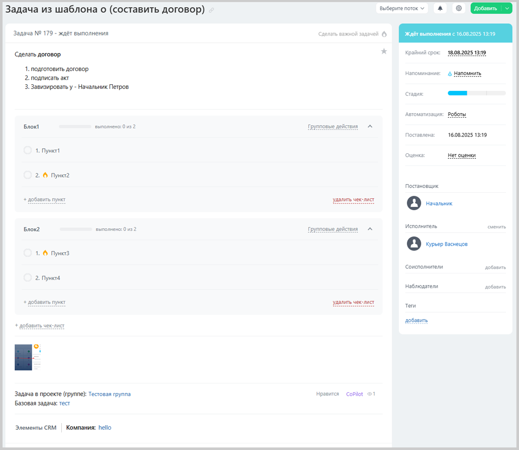 - у нас создалась задача по шаблону