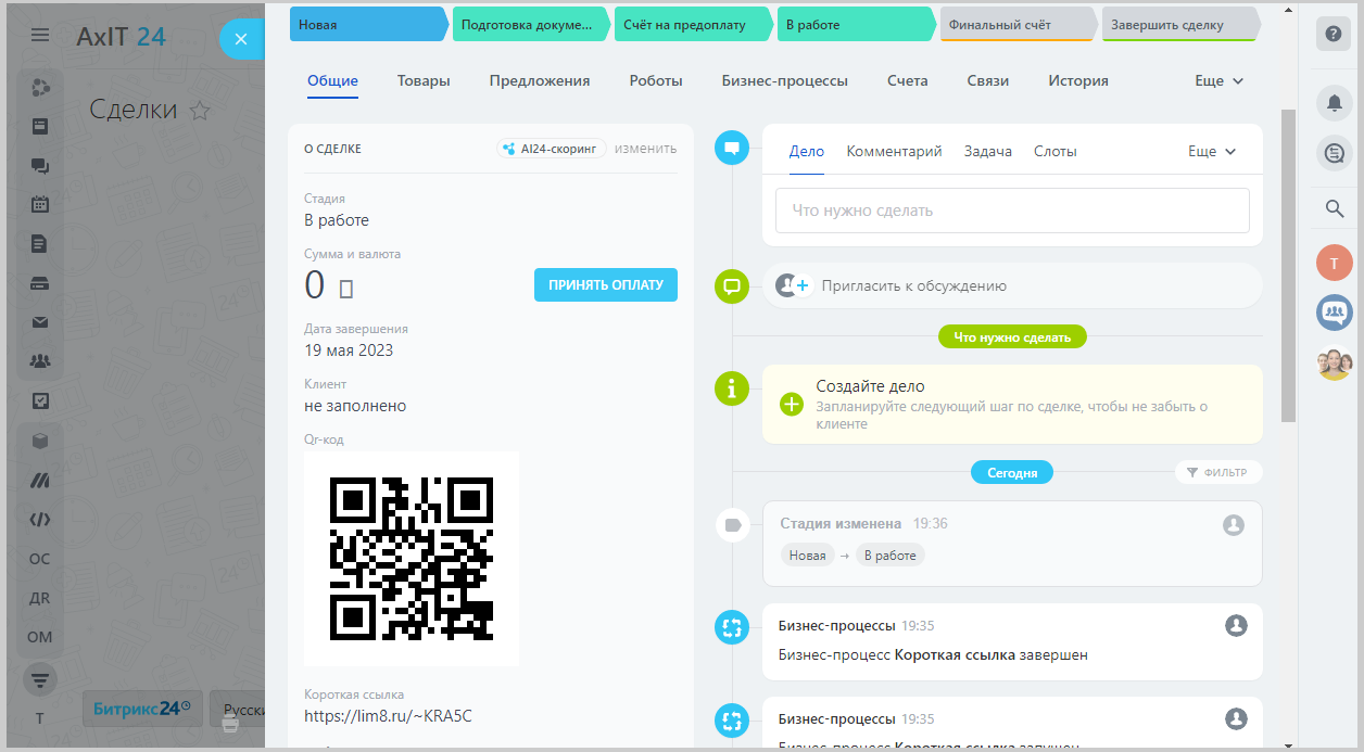 Используя приложение "Короткая ссылка с триггером" вы можете сформировать QR-код короткой ссылки, который можно как отправлять вашим клиентам, так и использовать при формировании любых документов из Битрикс24.