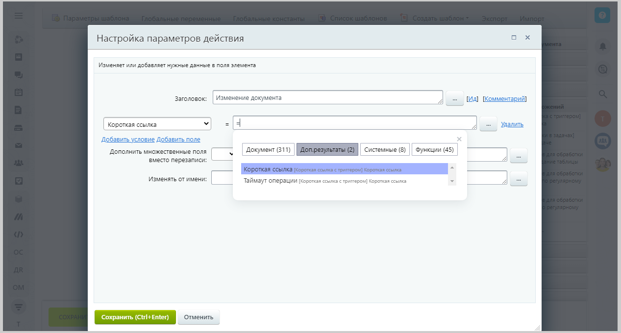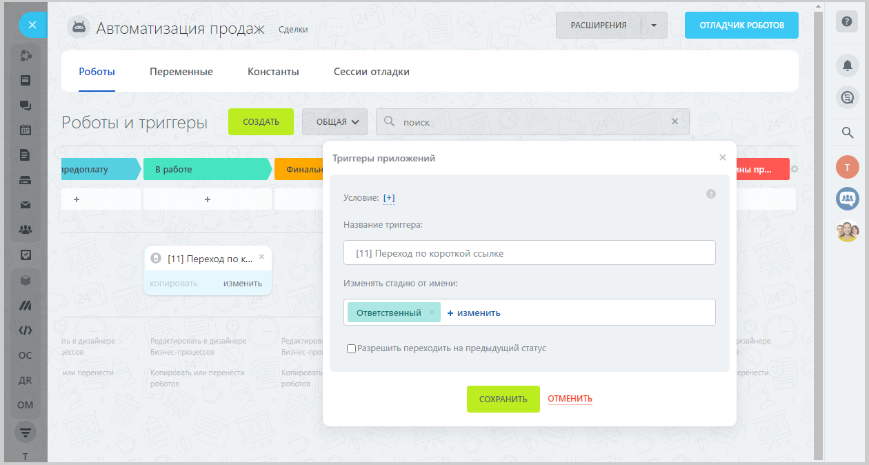 - Включить триггер - при включении данного параметра в короткую ссылку добавляется обработка. Триггер срабатывает при переходе клиента по указанной короткой ссылке. Предварительно триггер должен быть настроен в соответствующей воронке в сделках или лидах. Данный параметр проверяет корректность поля "обрабатываемая сущность", в случае некорректности данных в лог записывается сообщение об этом, ссылка не формируется и выполнение приложения завершается.