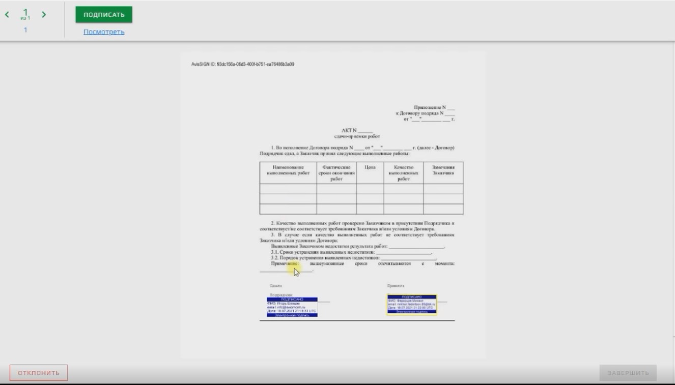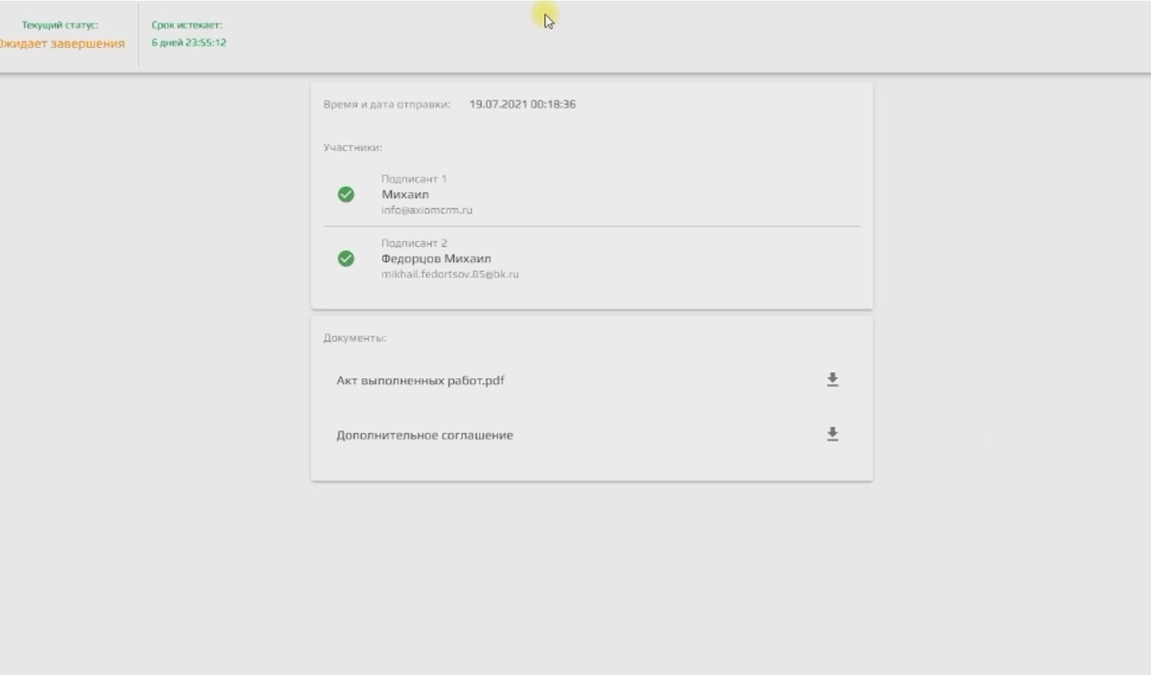 Контрагент или клиент получает на почту подписанный с Вашей стороны, он может предварительно ознакомиться с ним. И после подписать, нажав на зеленую кнопку.