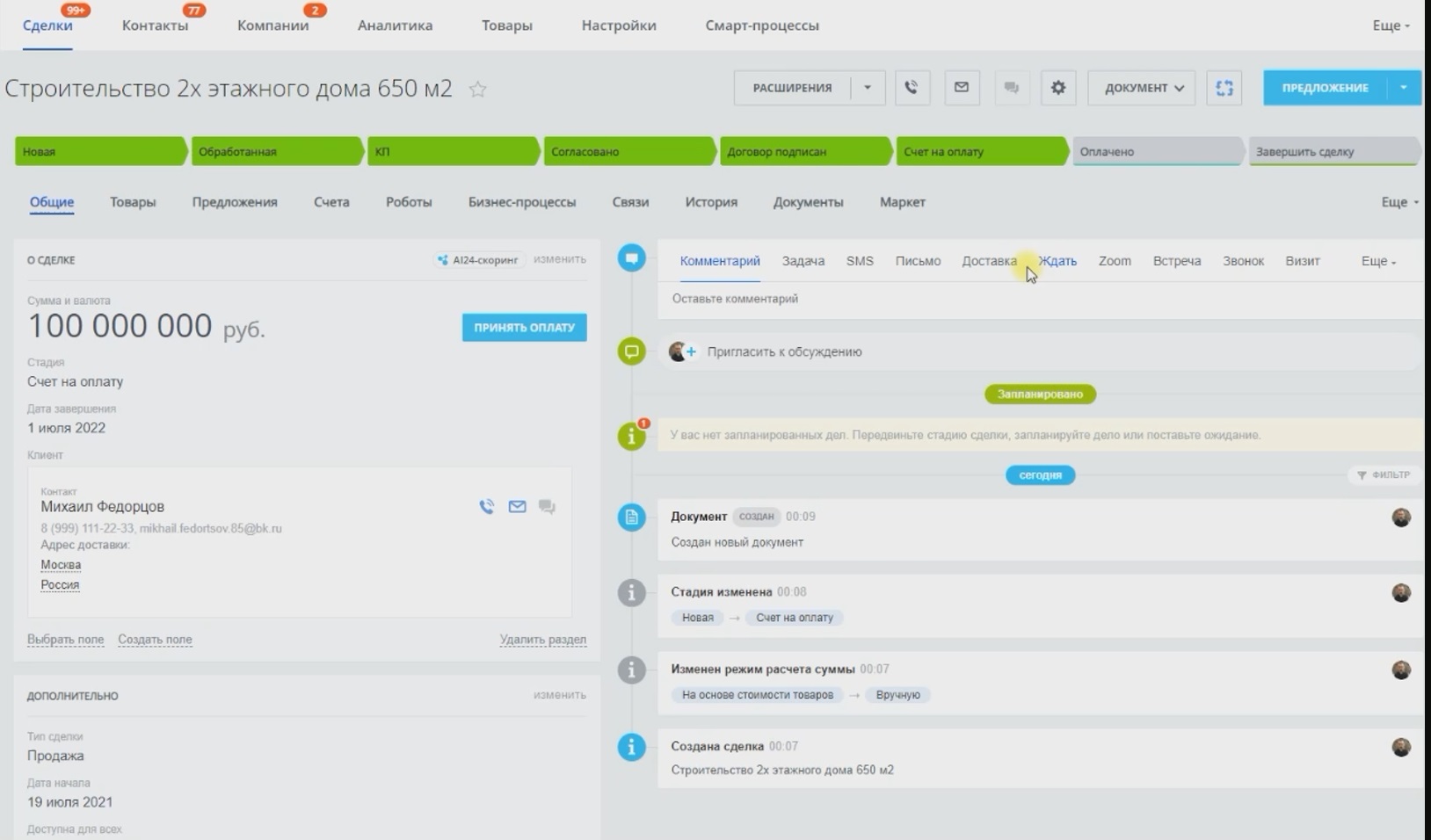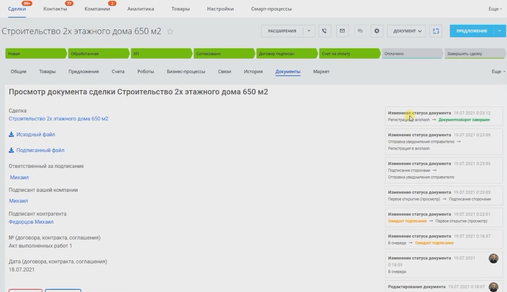Единая база позволяет увидеть в Битрикс24 документы по каждому контрагенту и сделке, статусы и отслеживать их движение.