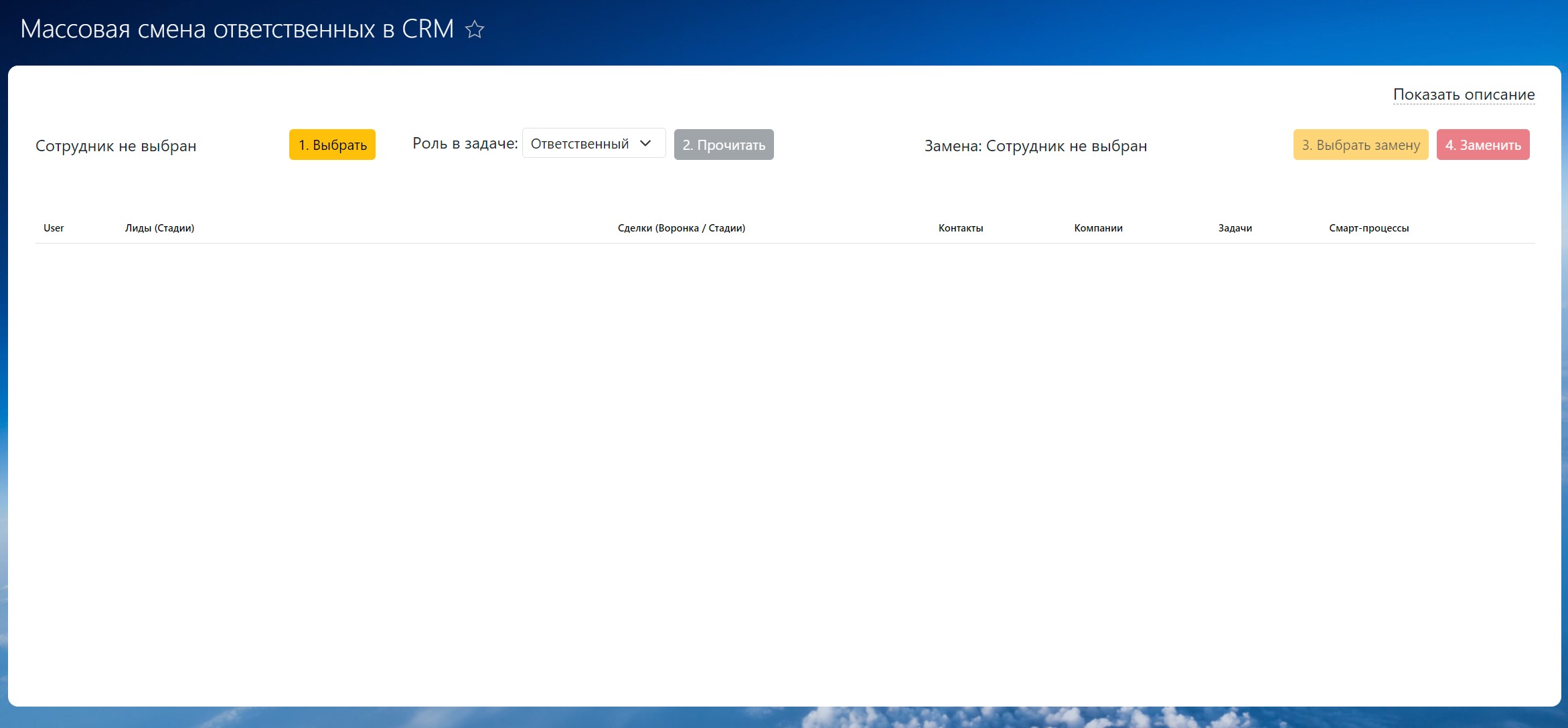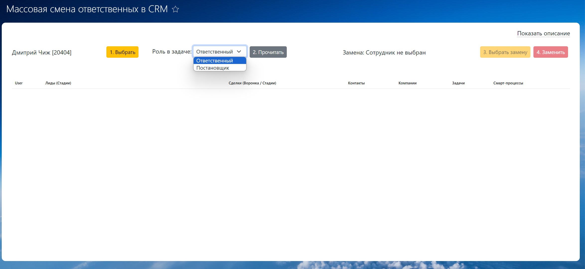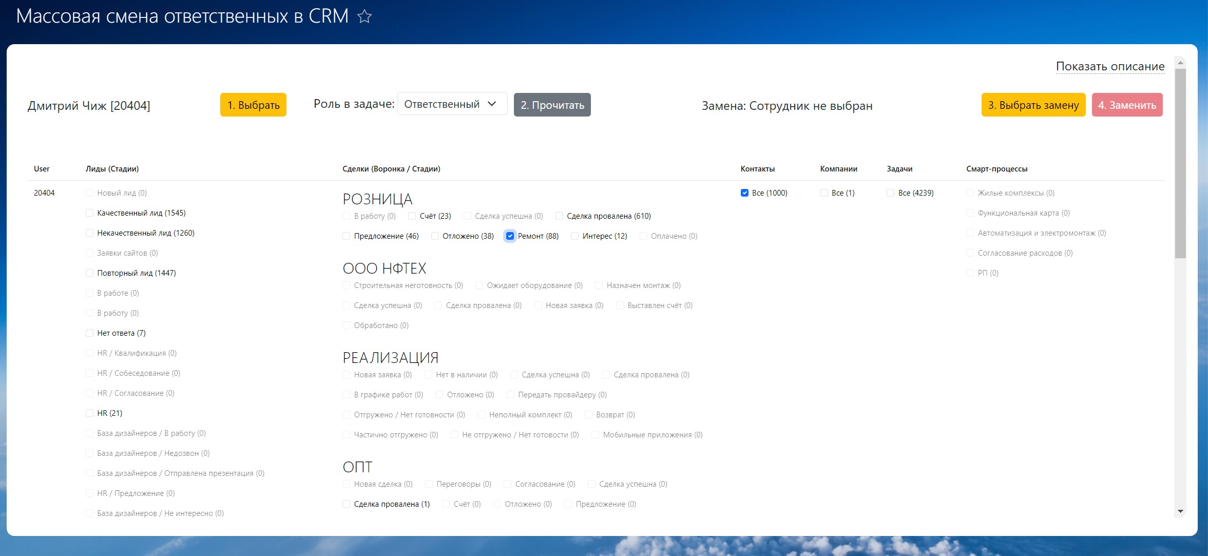 Приложение позволяет «в один клик» сменить ответственного сразу за все сущности: лиды, сделки, контакты, компании, смарт-процессы и задачи.