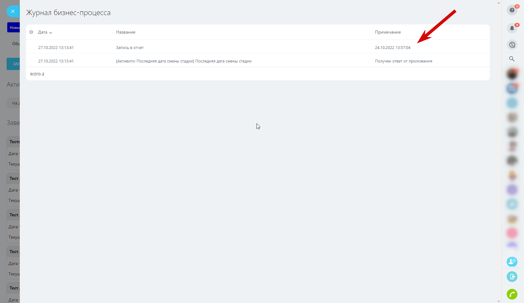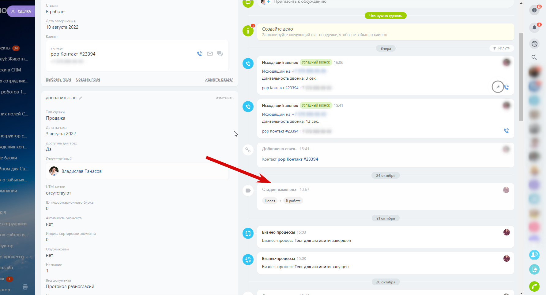 Возвращает дату попадания в нужную стадию (бизнес-процесс)