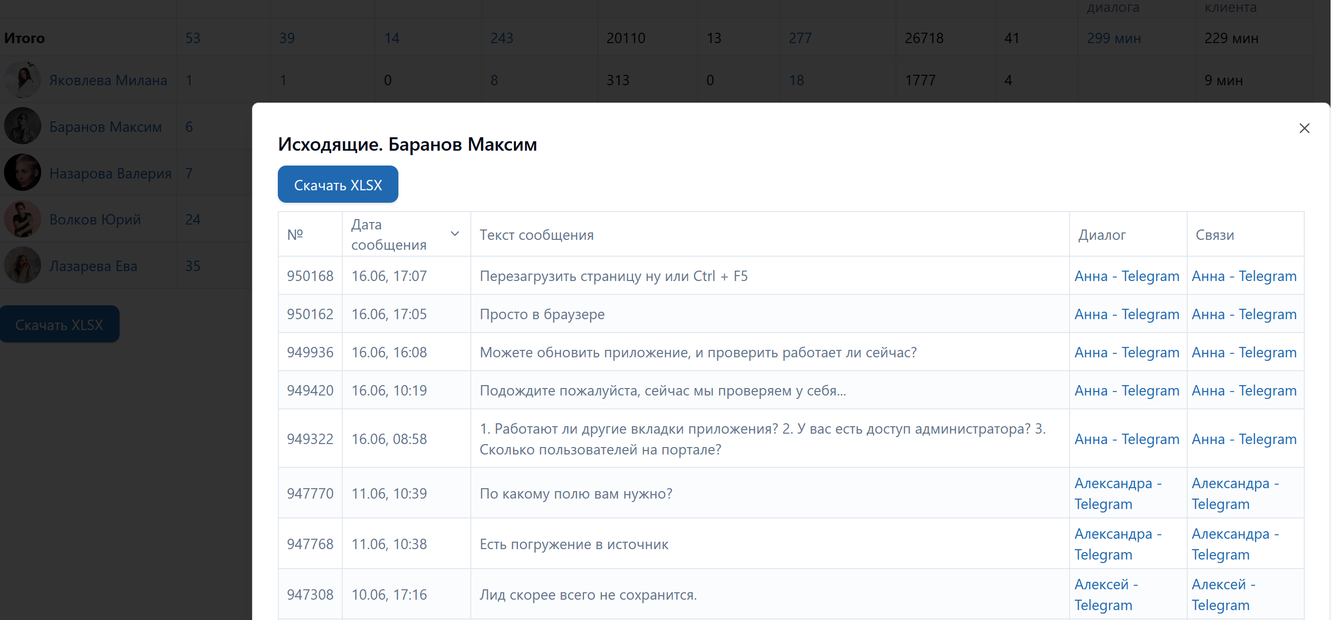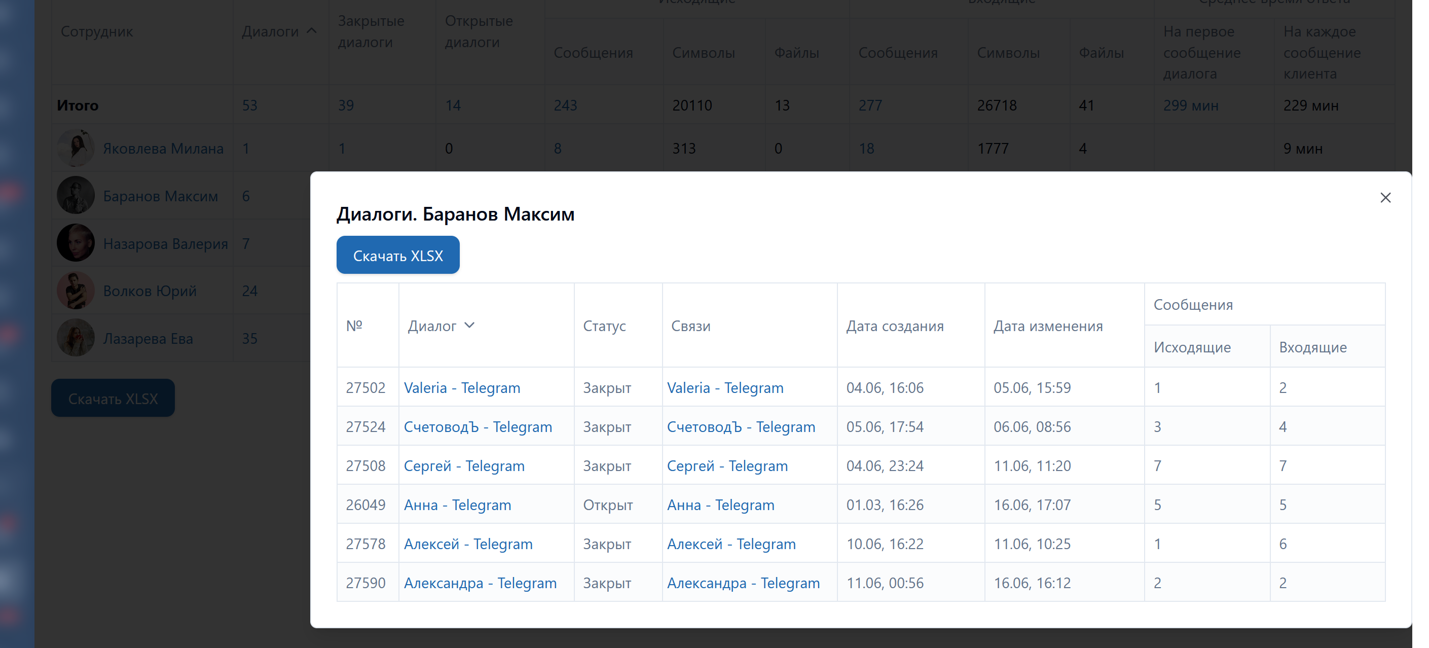 - Формирует детальную таблицу по диалогам сотрудников с указанием количества: диалогов (всех), закрытых диалогов, открытых диалогов, исходящих (сообщений, символов, файлов), входящих (сообщений, символов, файлов), среднего времени ответа (на первое сообщение диалога, на каждое сообщение клиента);