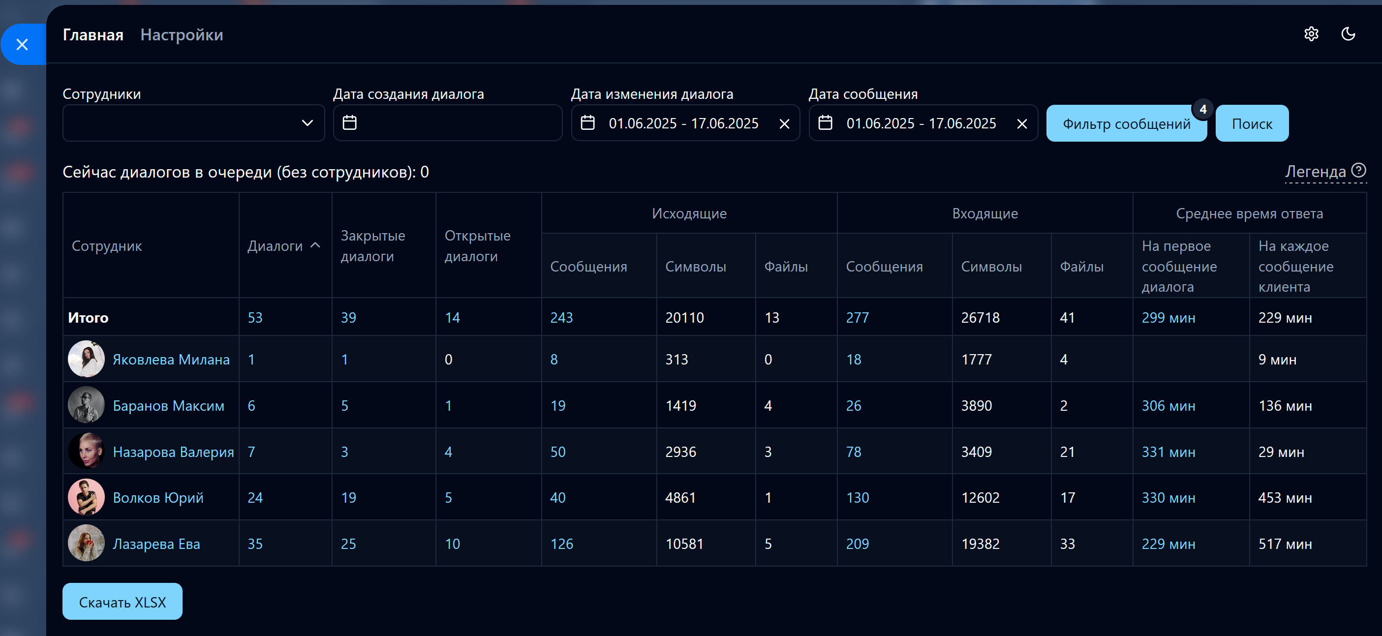 Отчет по статистике диалогов понравился тем, что в нем есть среднее время не только первого ответа, но и всех последующих ответов, что для нас критически важно.