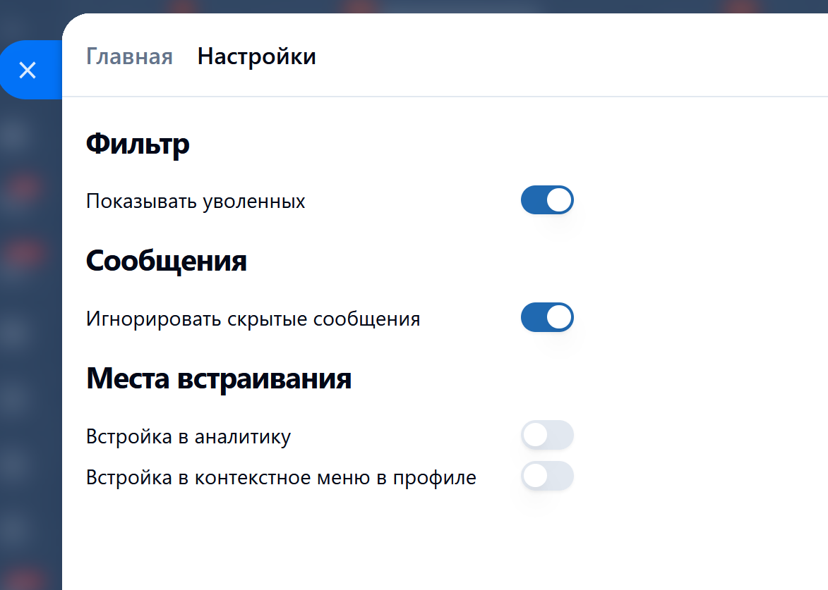 - Во вкладке "Настройки" включить/выключить анализ по уволенным, анализ по скрытым сообщениям.