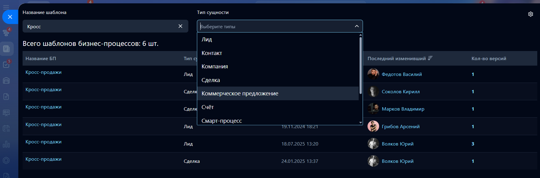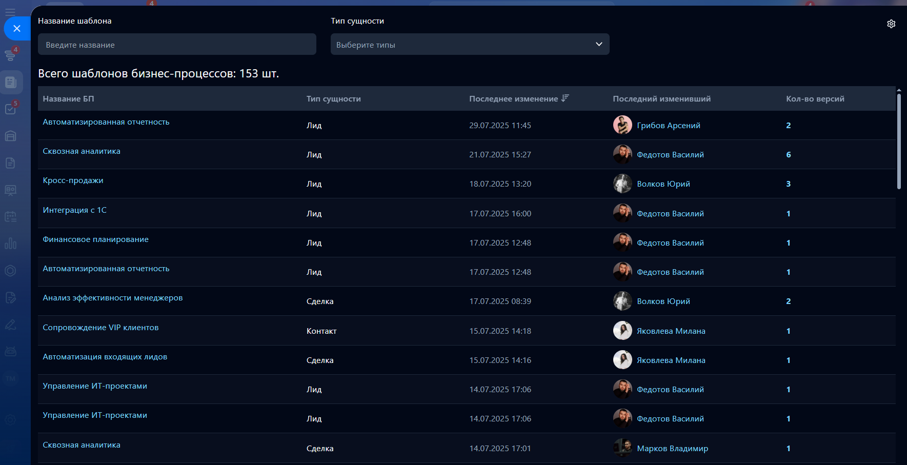 - Просмотр списков версий бизнес-процессов;