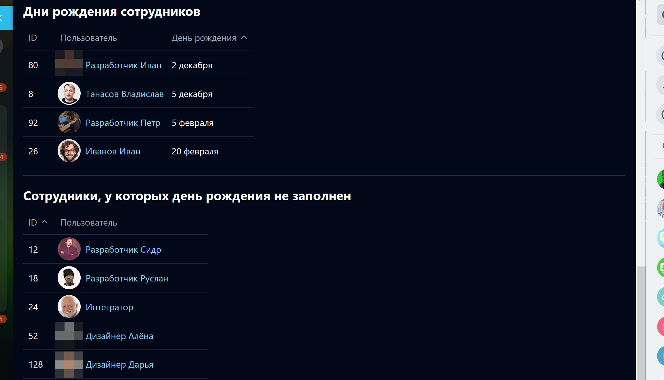 - Проверьте, что поле "Дата рождения" у сотрудников заполнены.