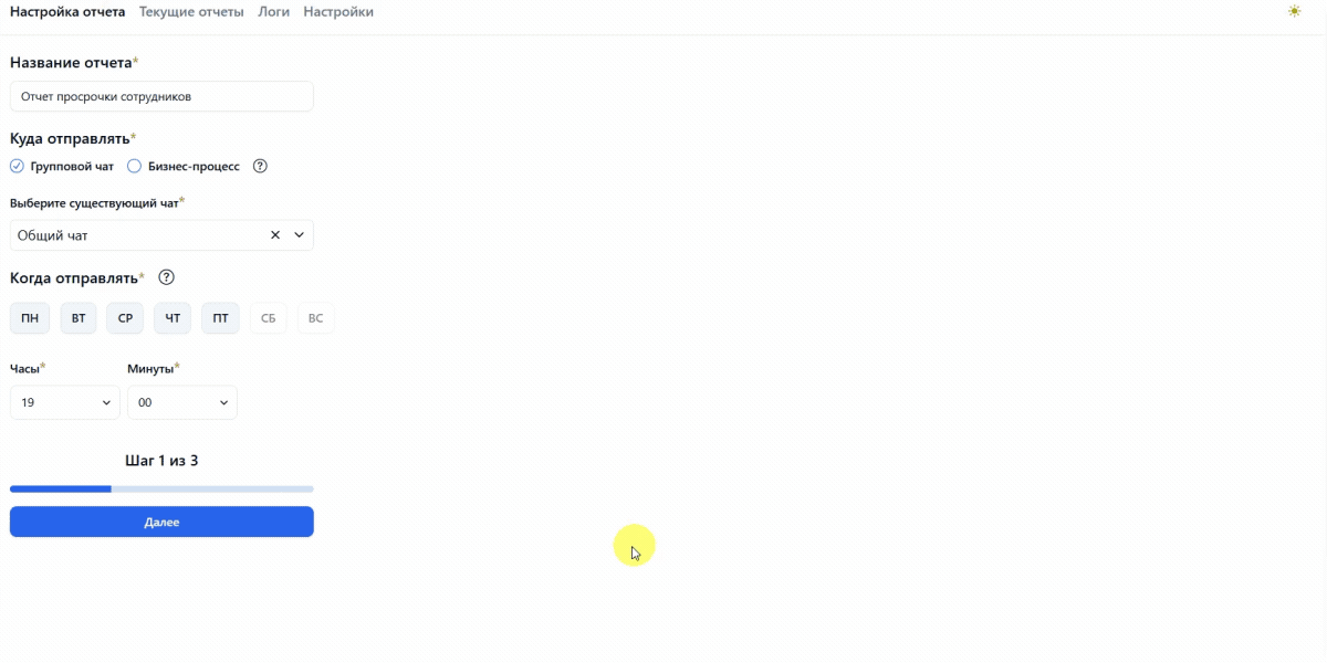 Выбирайте время и как отправлять отчёт (через чат или запускать бизнес-процесс).