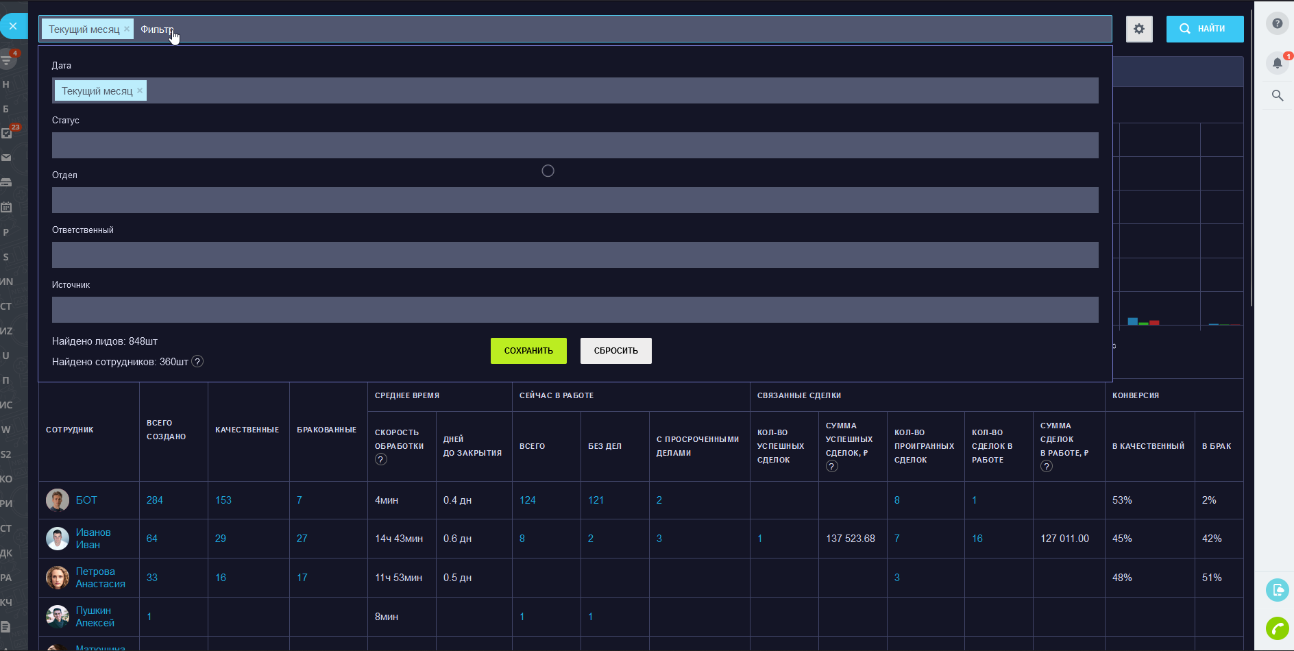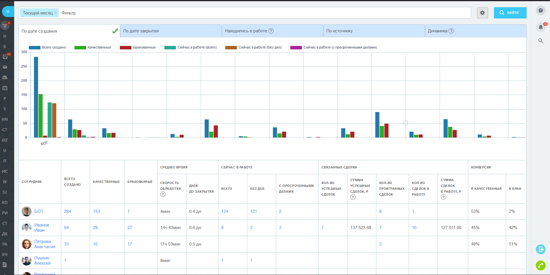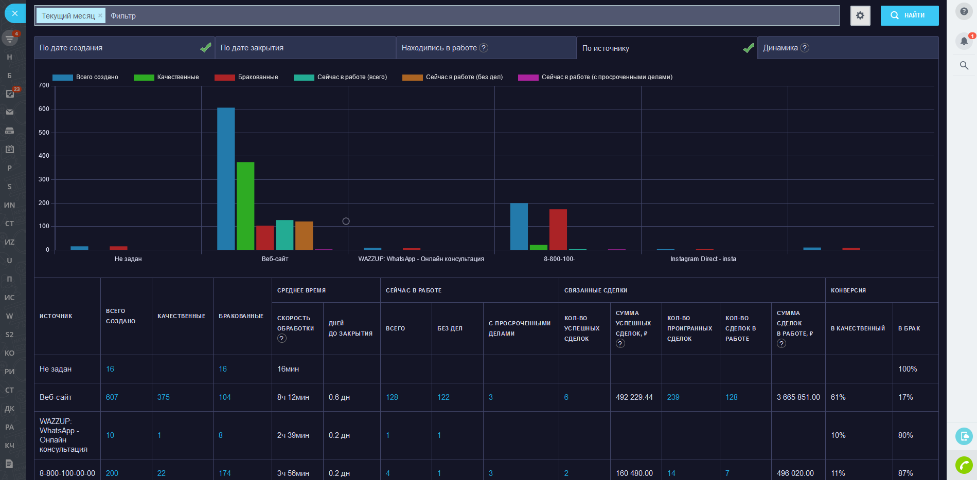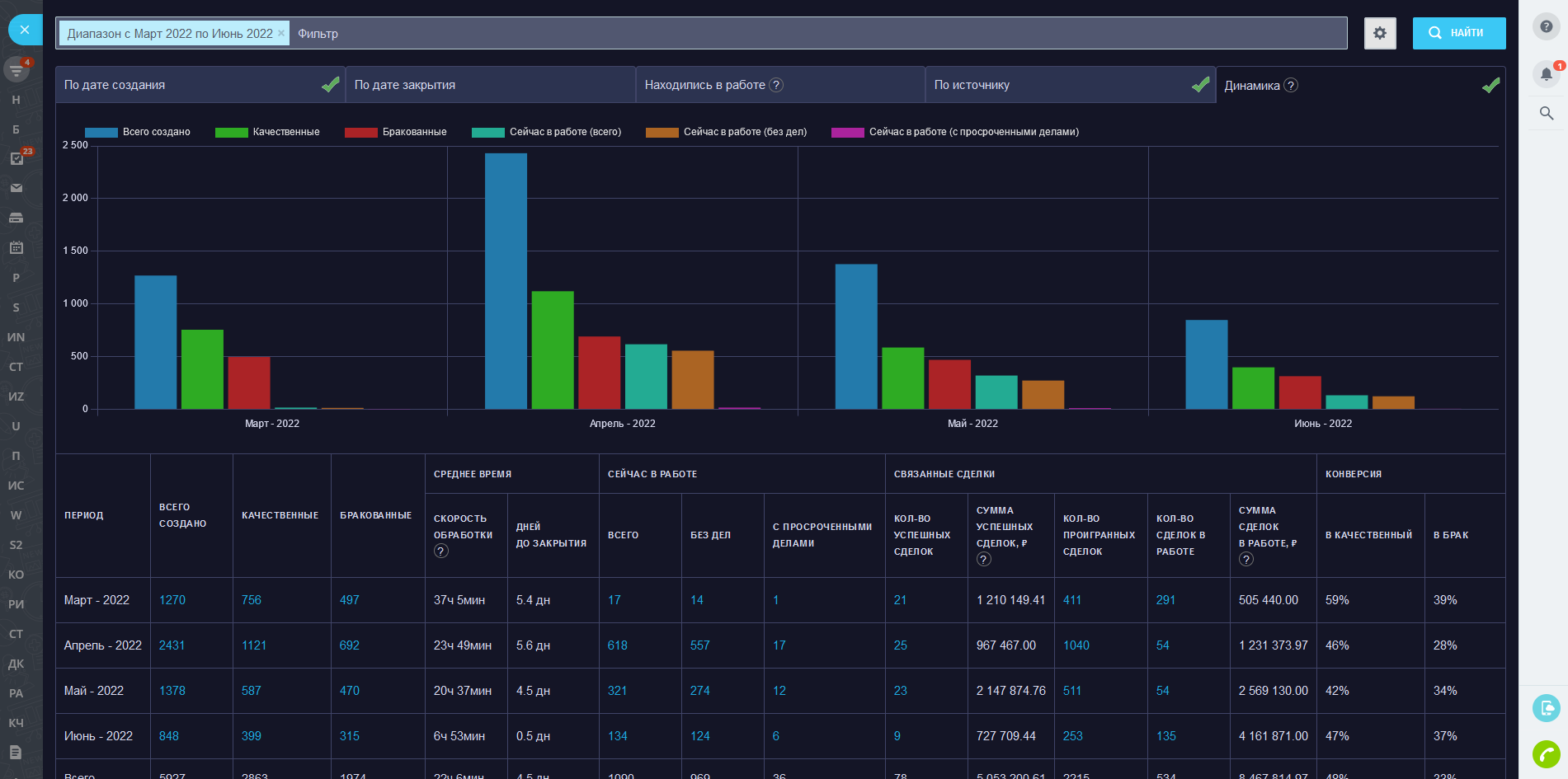 - Конверсии: в качественный лид (сделку), в брак, в успешную сделку.