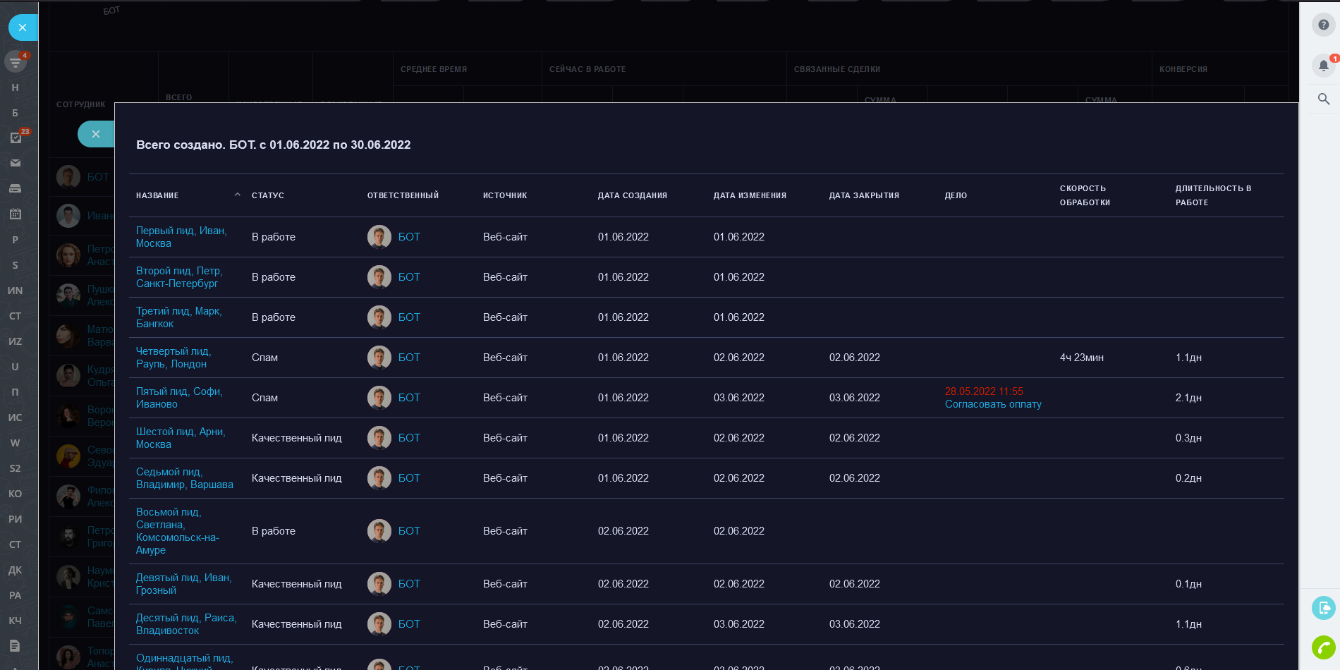 - Скорость обработки - время между созданием лида и первой сменой статуса лида (в рабочих минутах);