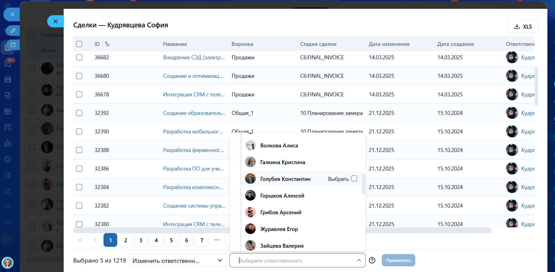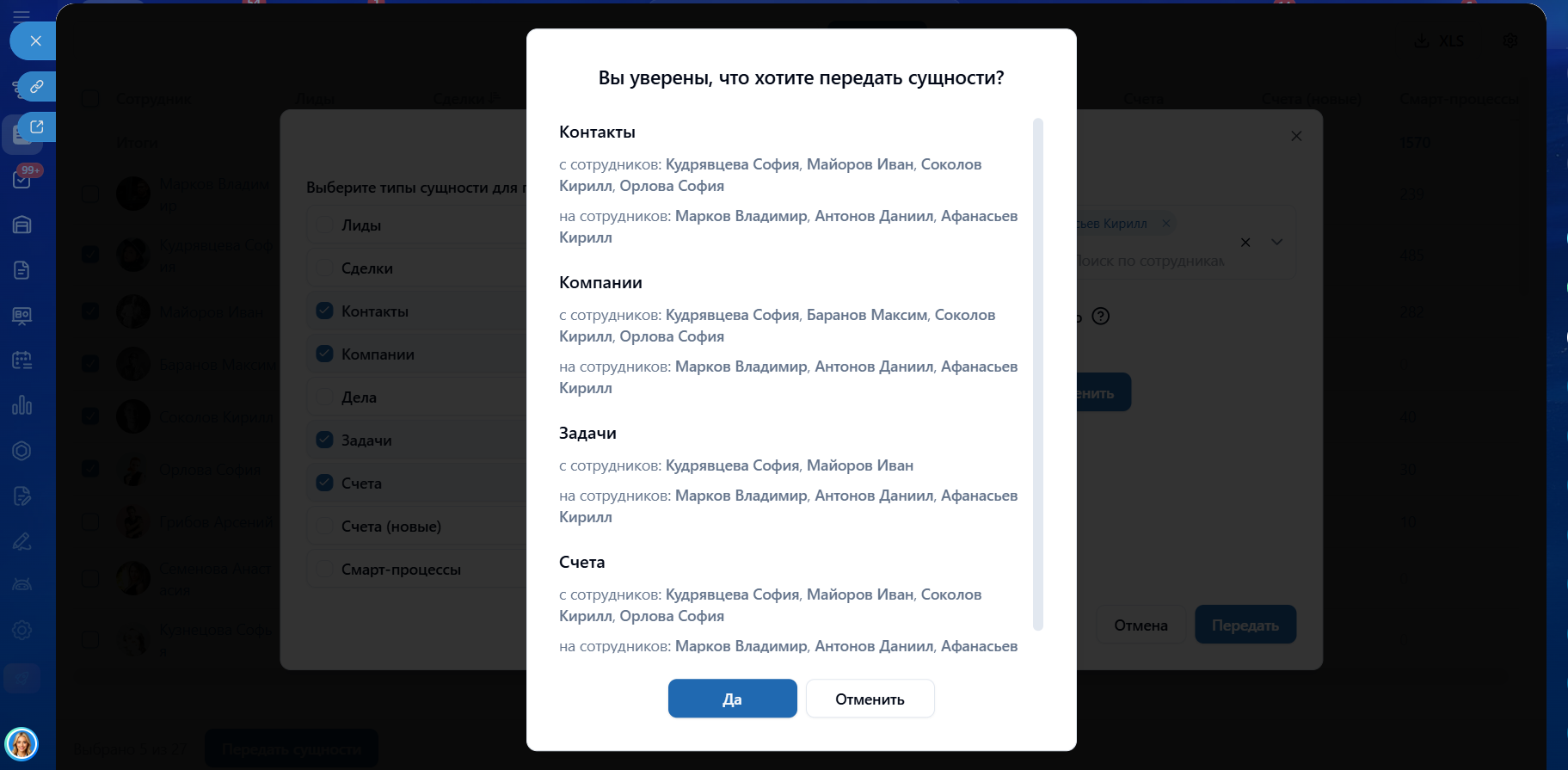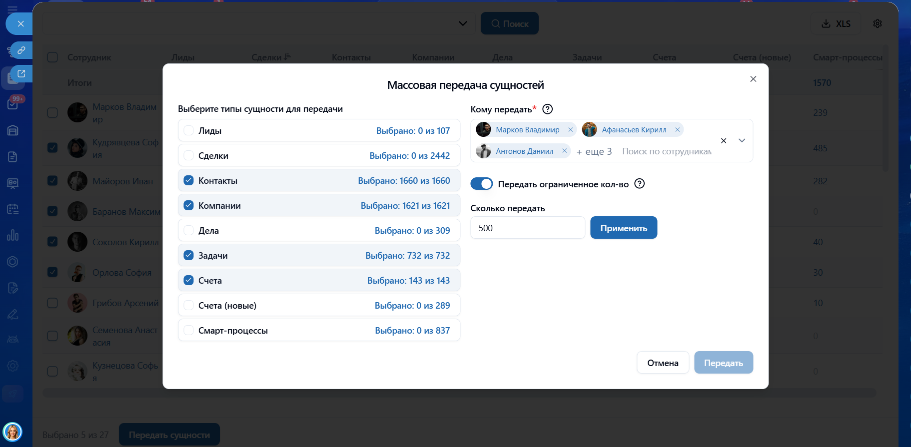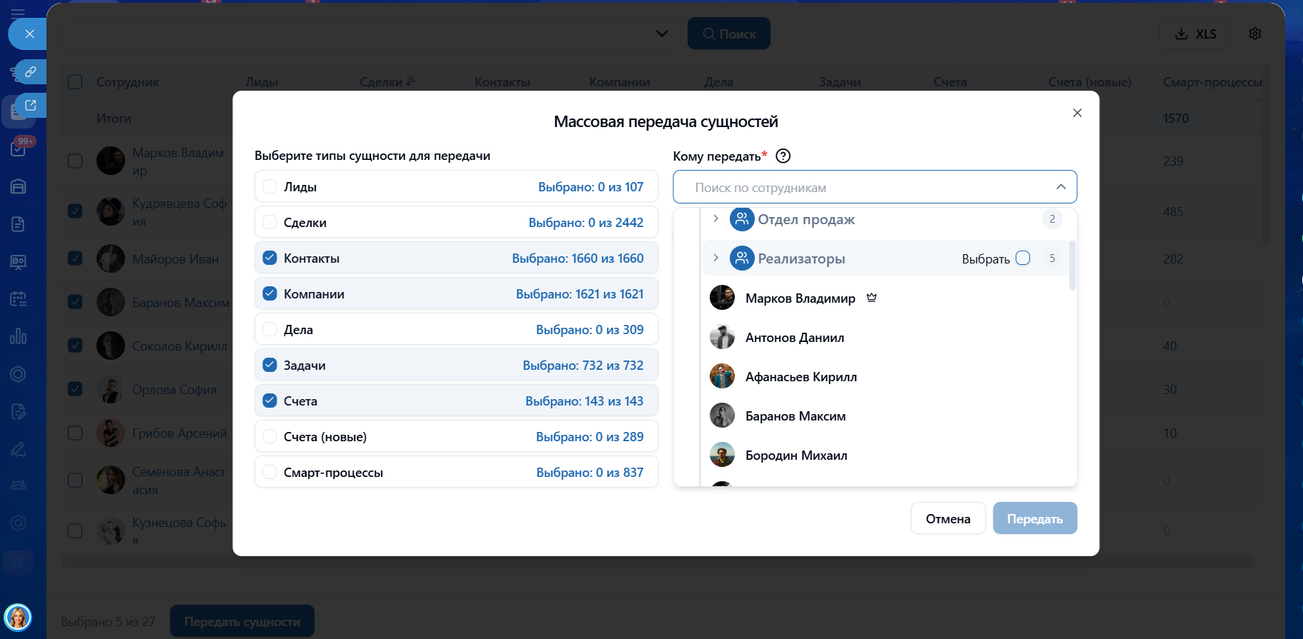 Массовая передача дел, задач и элементов CRM