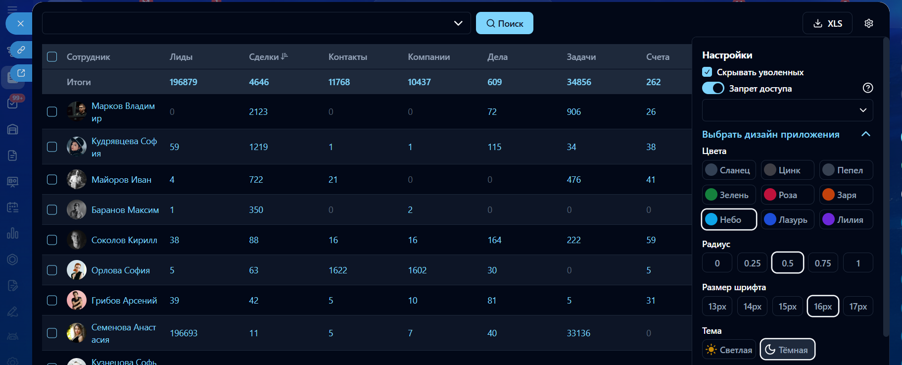 - Скрывать/показывать уволенных сотрудников;