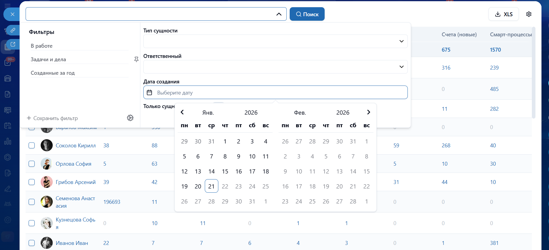 - Экспорт в XLS всех табличных данных.