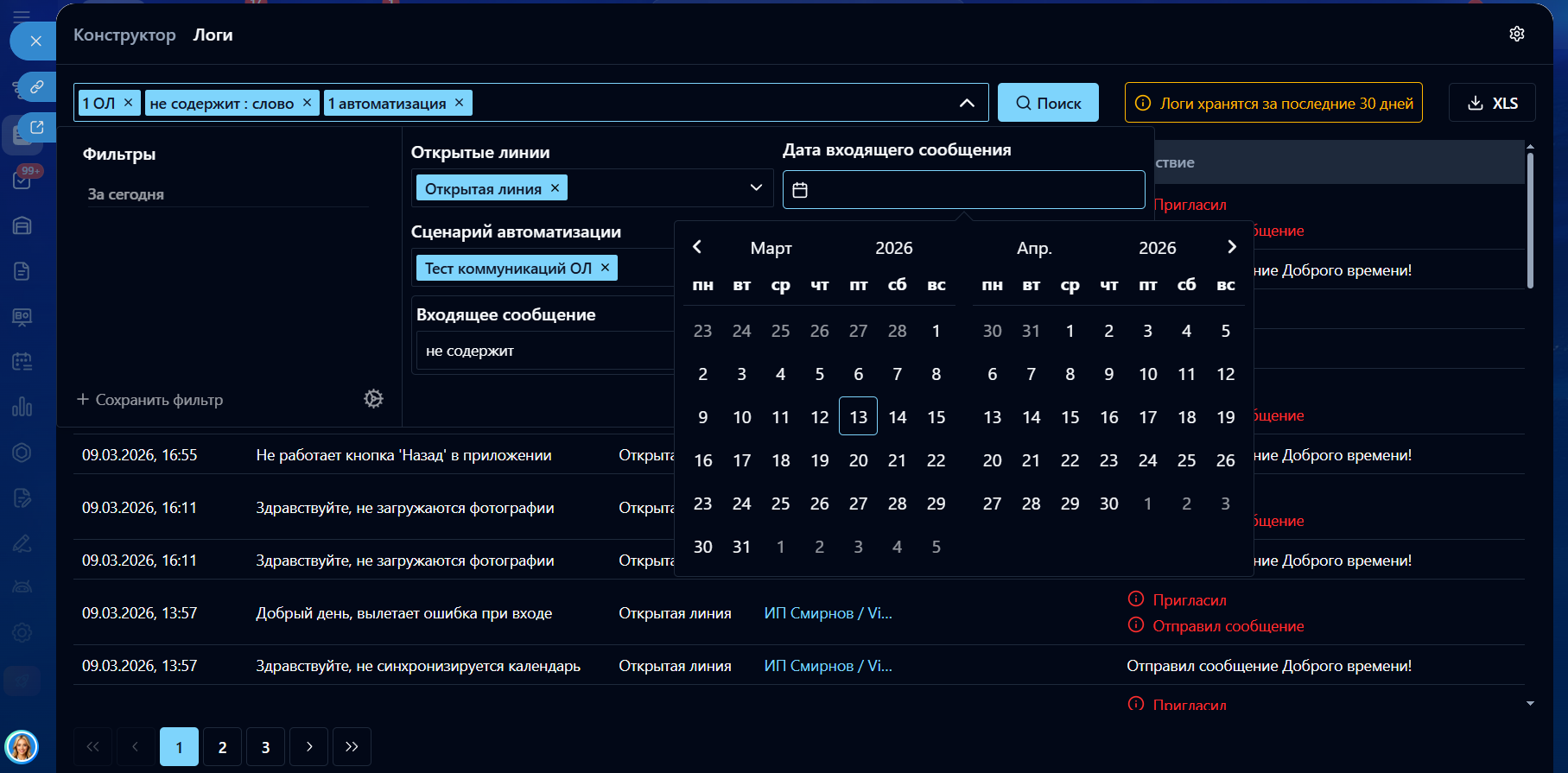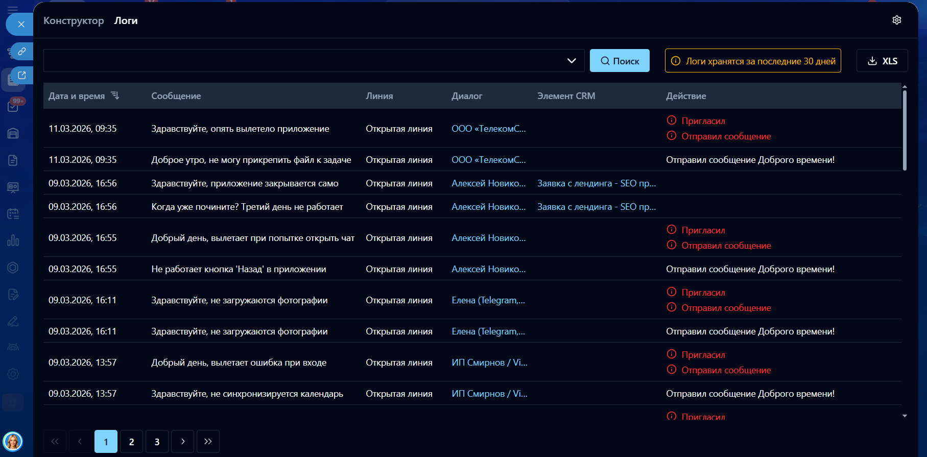 - Табличный вывод логов автоматизированных диалогов (дата и время, сообщение, линия, диалог, элемент CRM, действие).
