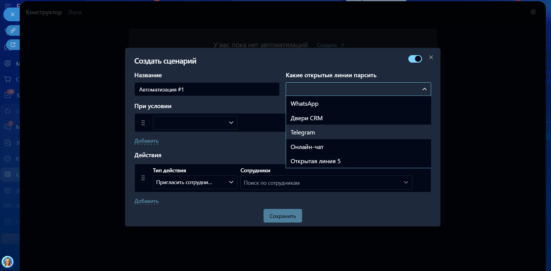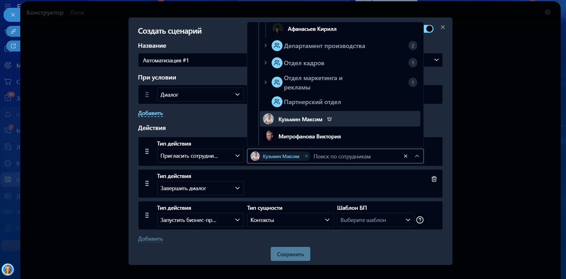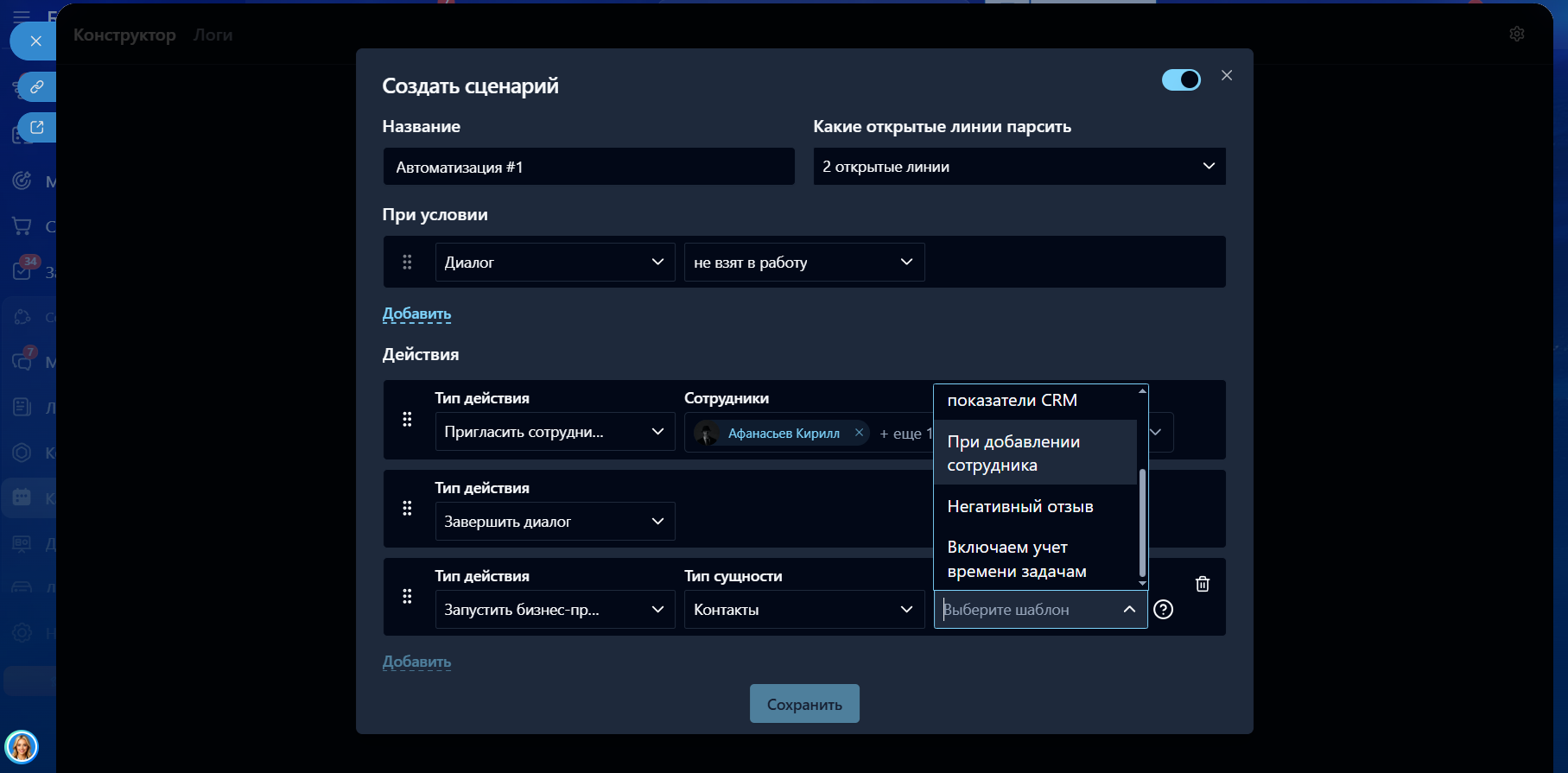 - Добавить несколько действий: отправить сообщение (от кого, текст), пригласить сотрудников (фильтр по сотрудникам и отделам), запустить бизнес-процесс (выбор сущностей и шаблонов БП, ведь диалог может крепиться к разным сущностям. Поддерживаются лиды, сделки, контакты, компании), завершить диалог.