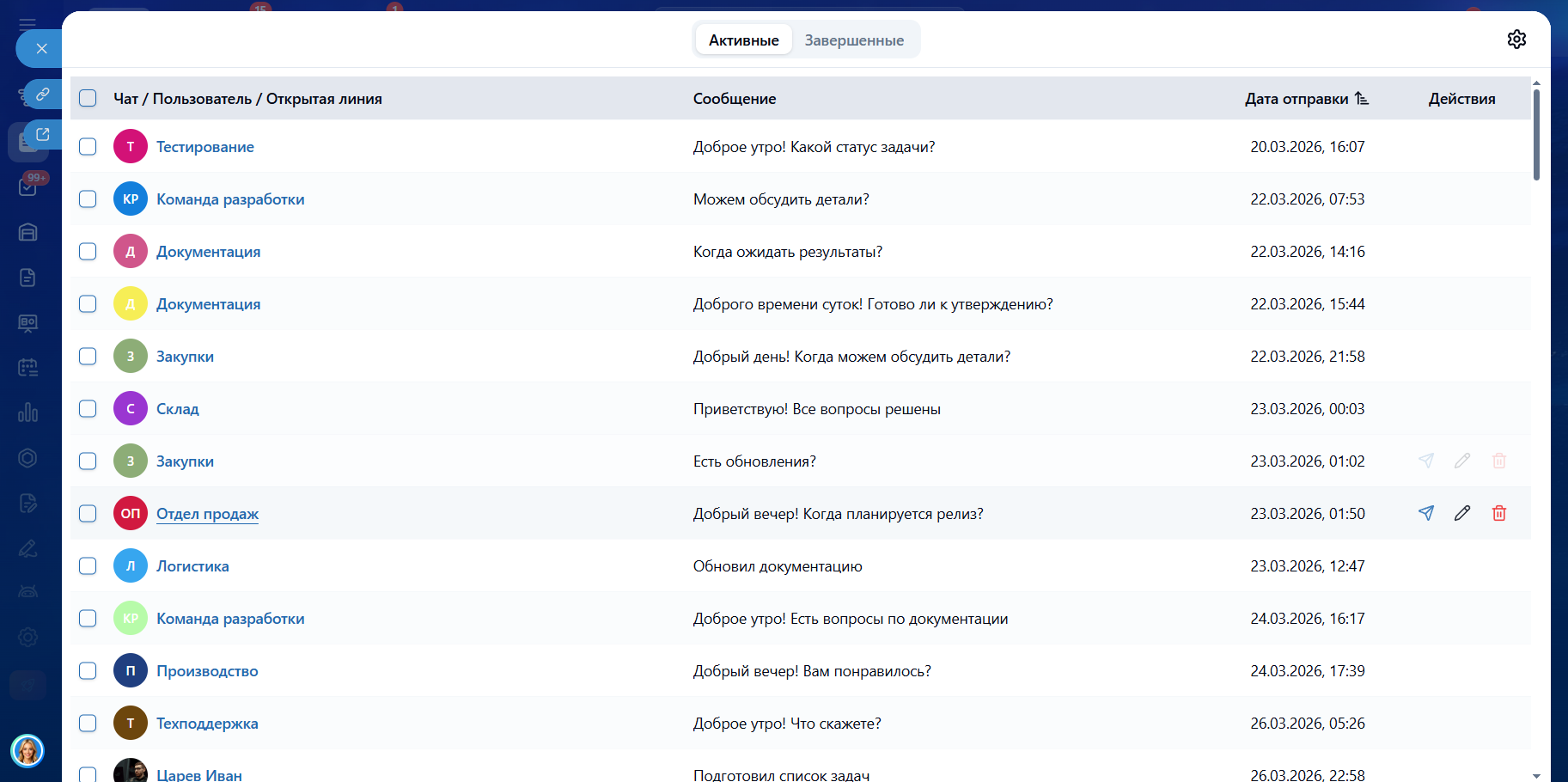 - Список активных отложенных сообщений (поля: Чат / Пользователь / Открытая линия, Сообщение, Дата отправки, Действия - отправить сейчас, редактировать, удалить);