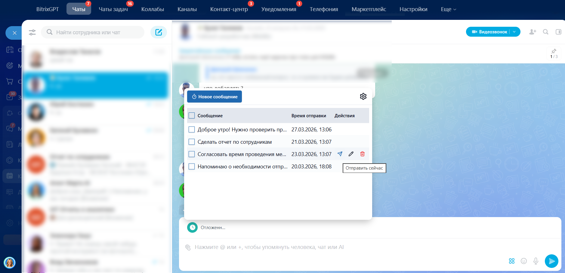 - При необходимости отложенное сообщение можно: отправить сейчас, редактировать, изменить время отправки или отменить отправку.