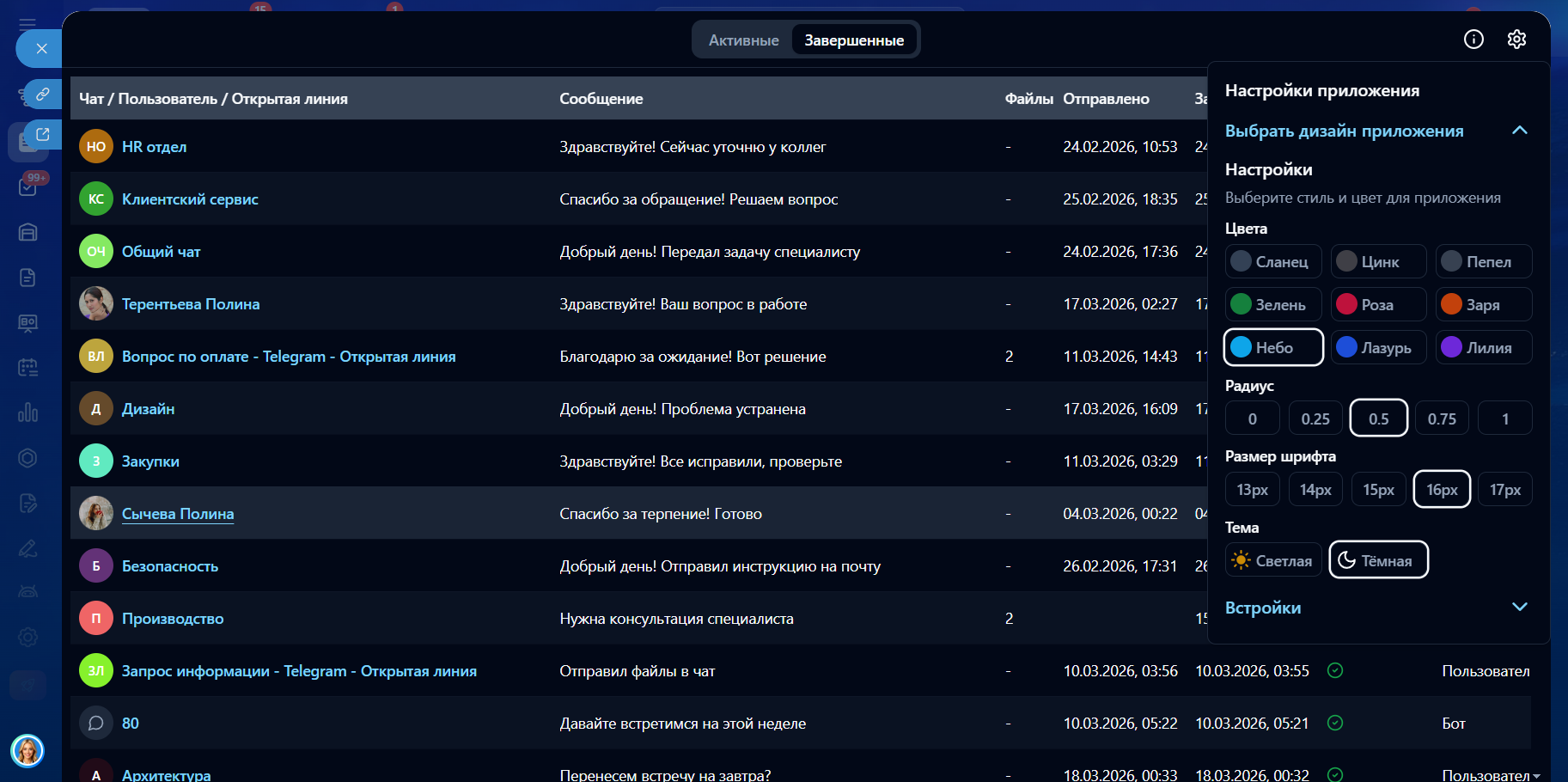 - Архив завершенных отложенных сообщений (поля: Чат / Пользователь / Открытая линия, Сообщения, Файлы, Когда отправлено, Когда запланировано, Статус, отправитель);