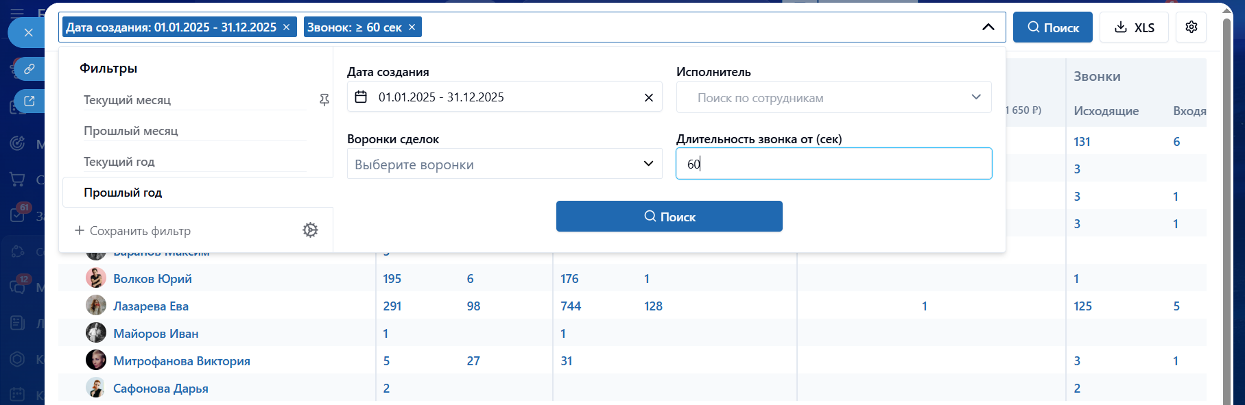 - Пресеты (текущий месяц, прошлый месяц, текущий год, прошлый год);