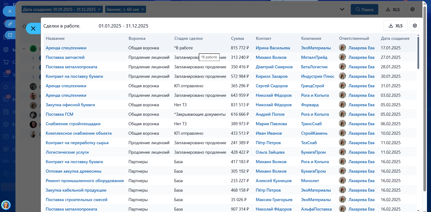 Данные по показателям отделов и сотрудников этих отделов: лиды, сделки, счета (новые и старые), звонки, письма.