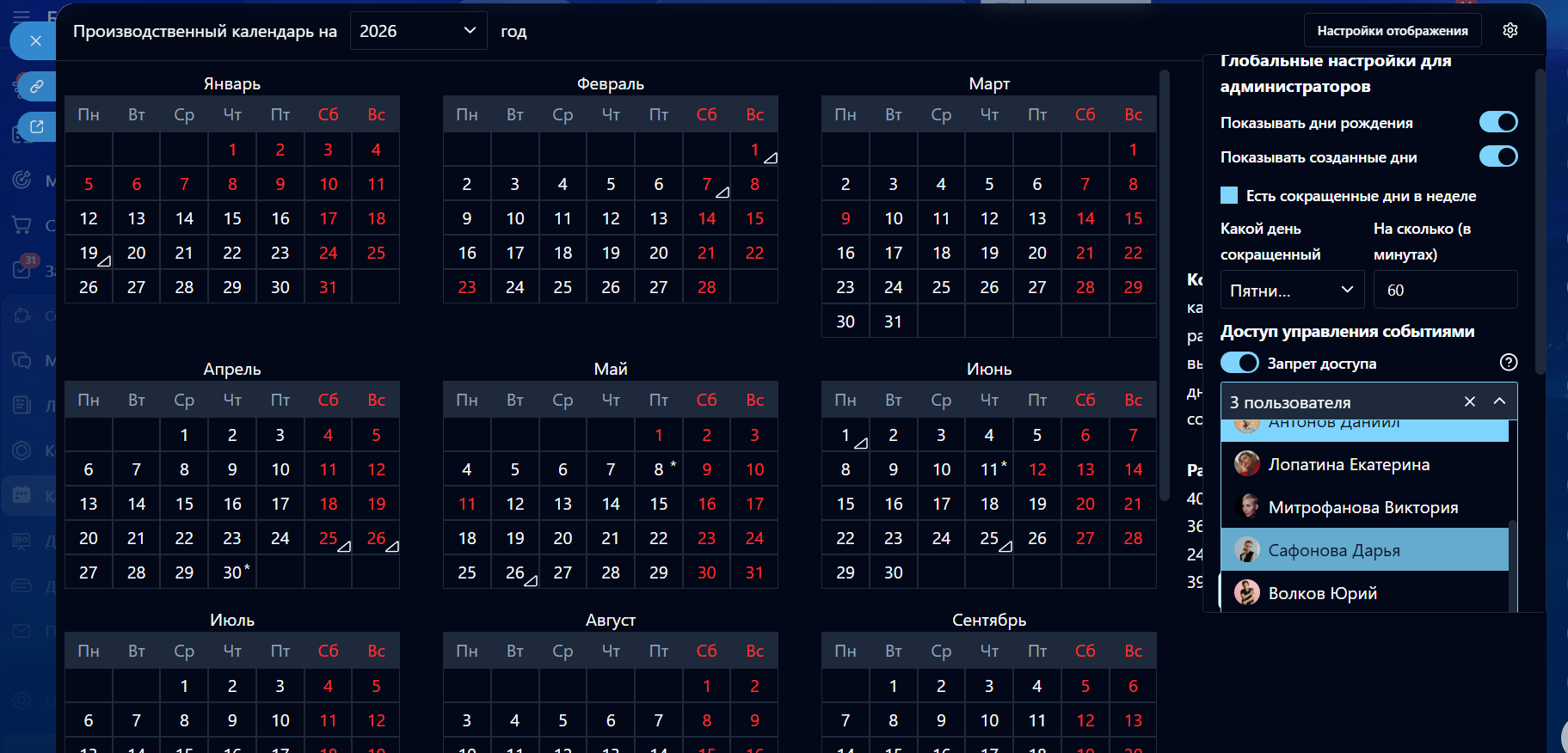 - Дни рождения сотрудников (вкл./выкл.);