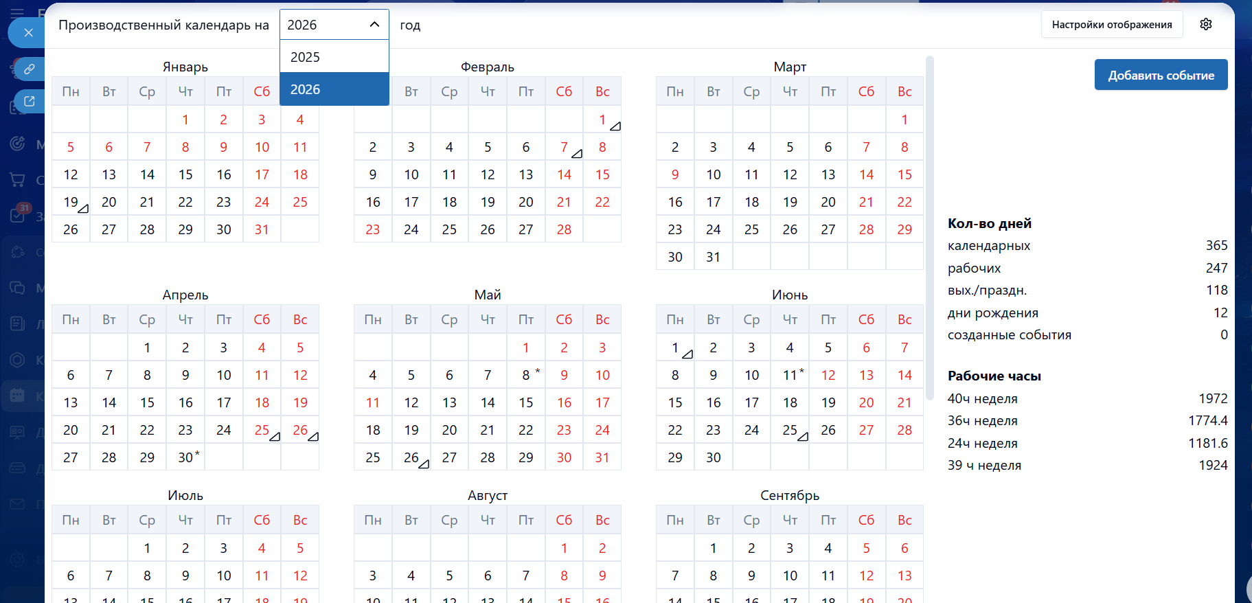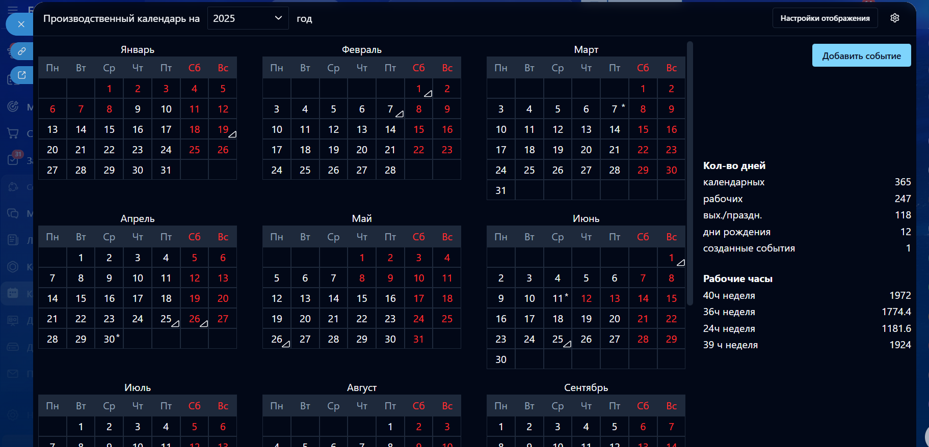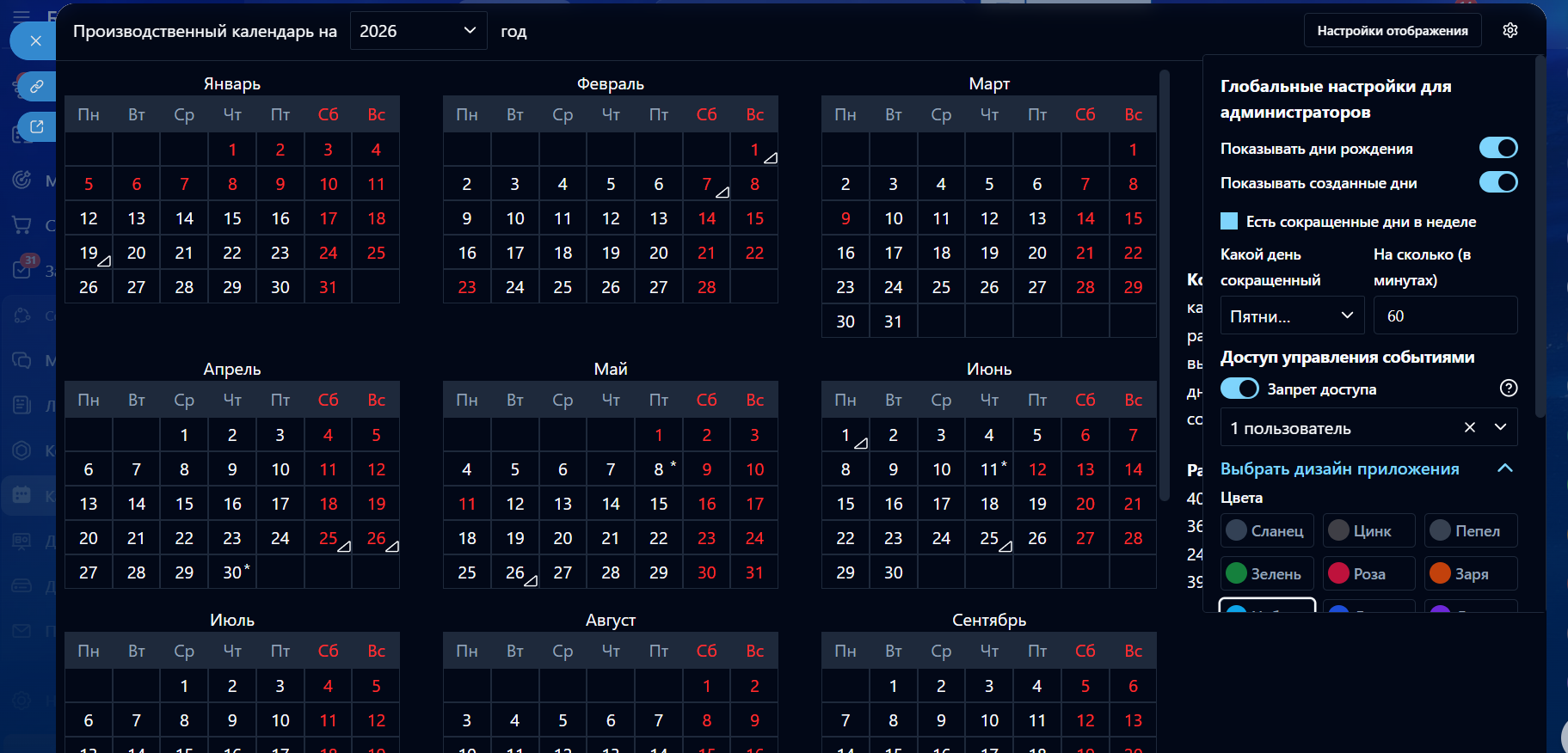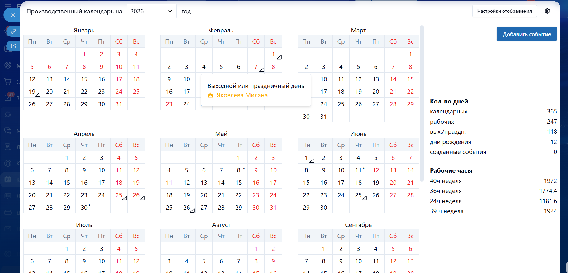 Рабочие дни и праздники, дни рождения, свои события компании