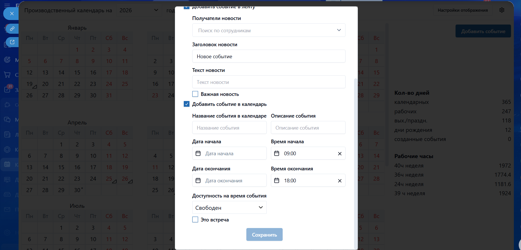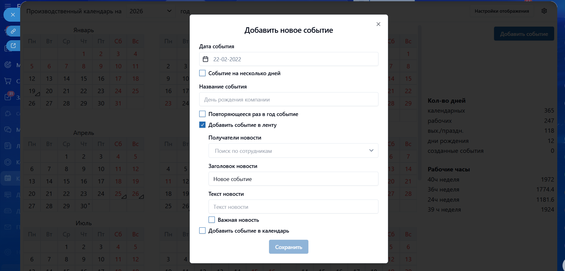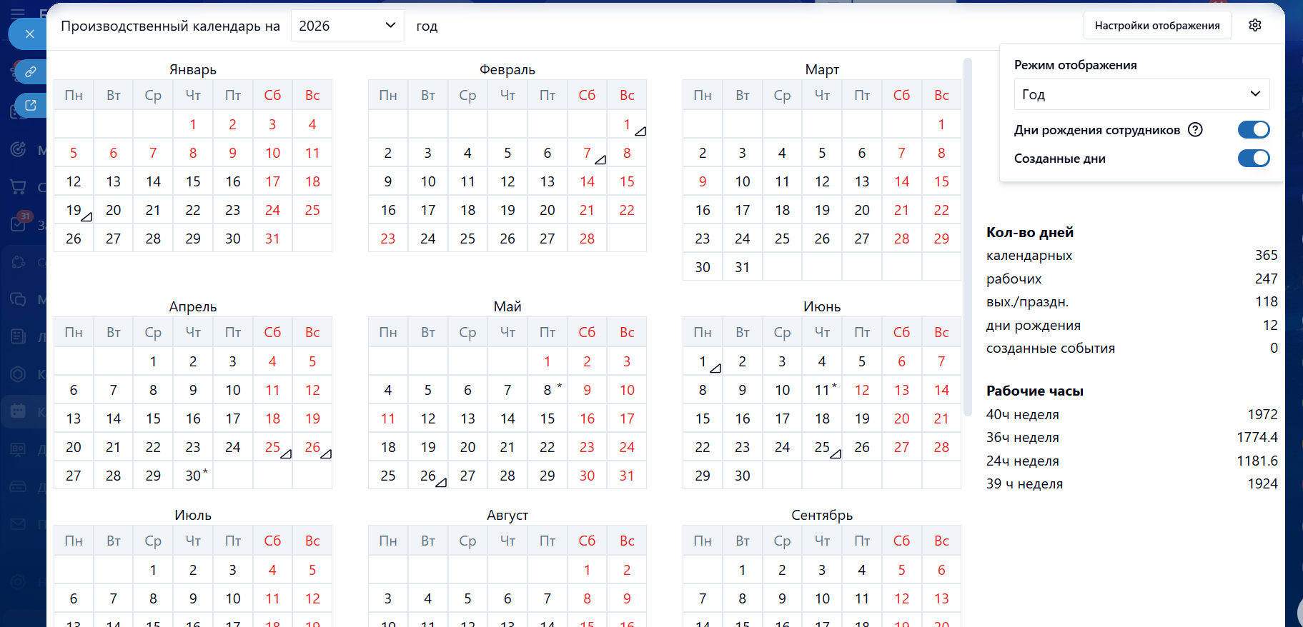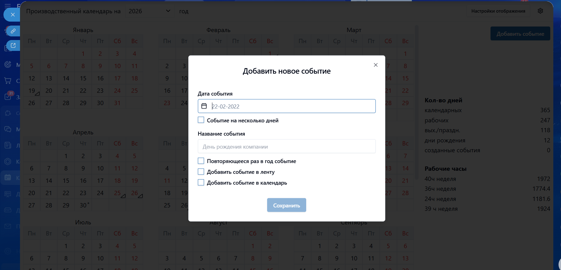 Рабочие дни и праздники, дни рождения, свои события компании