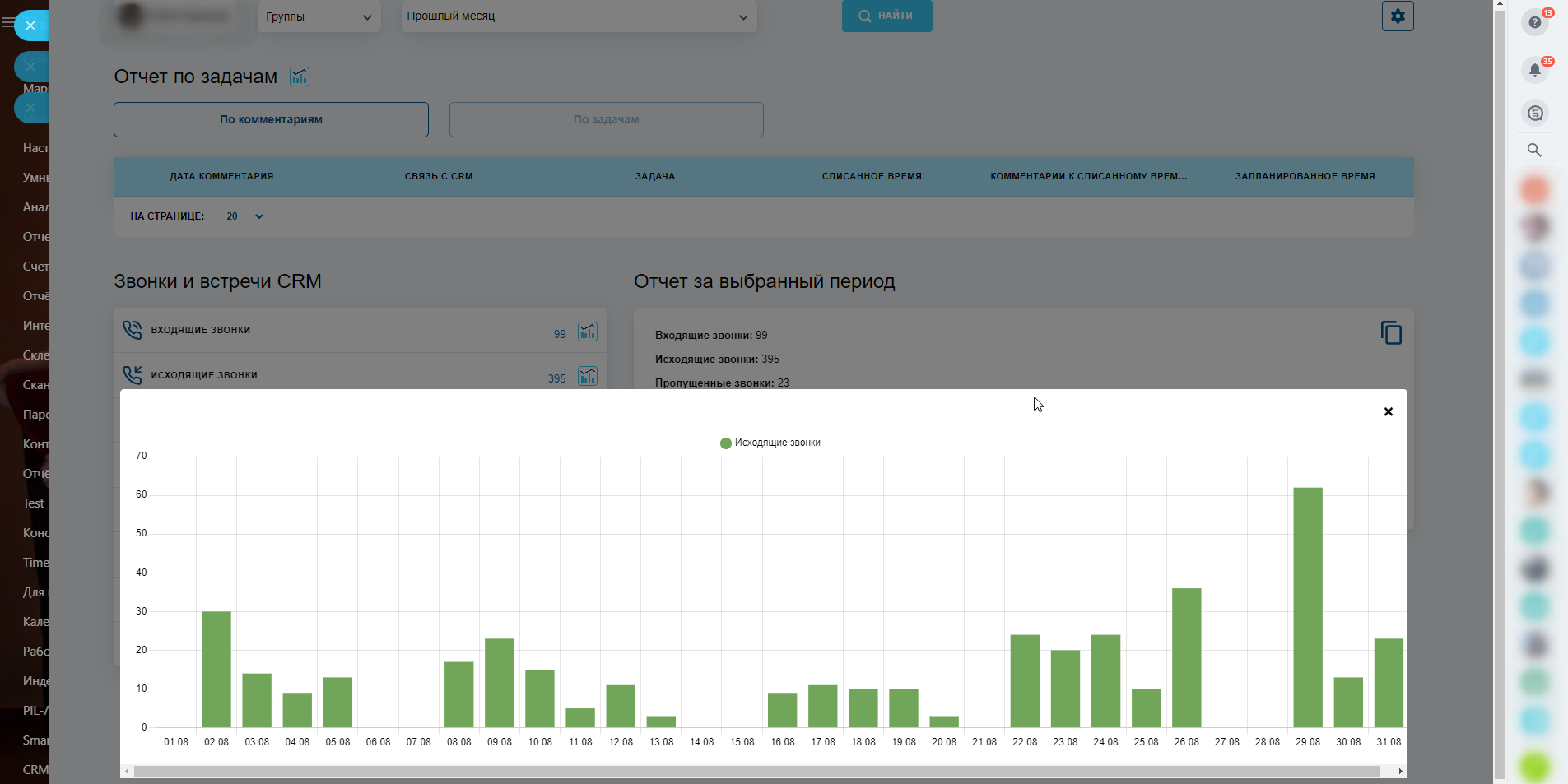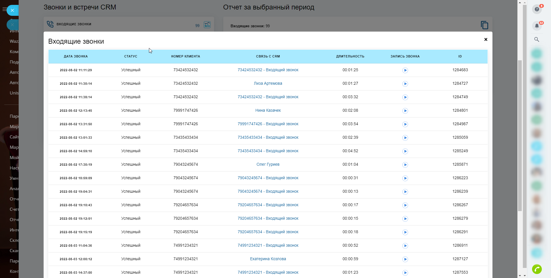 - Звонки: входящие, исходящие, пропущенные, запланированные (с минимальным порогом количества секунд разговора);