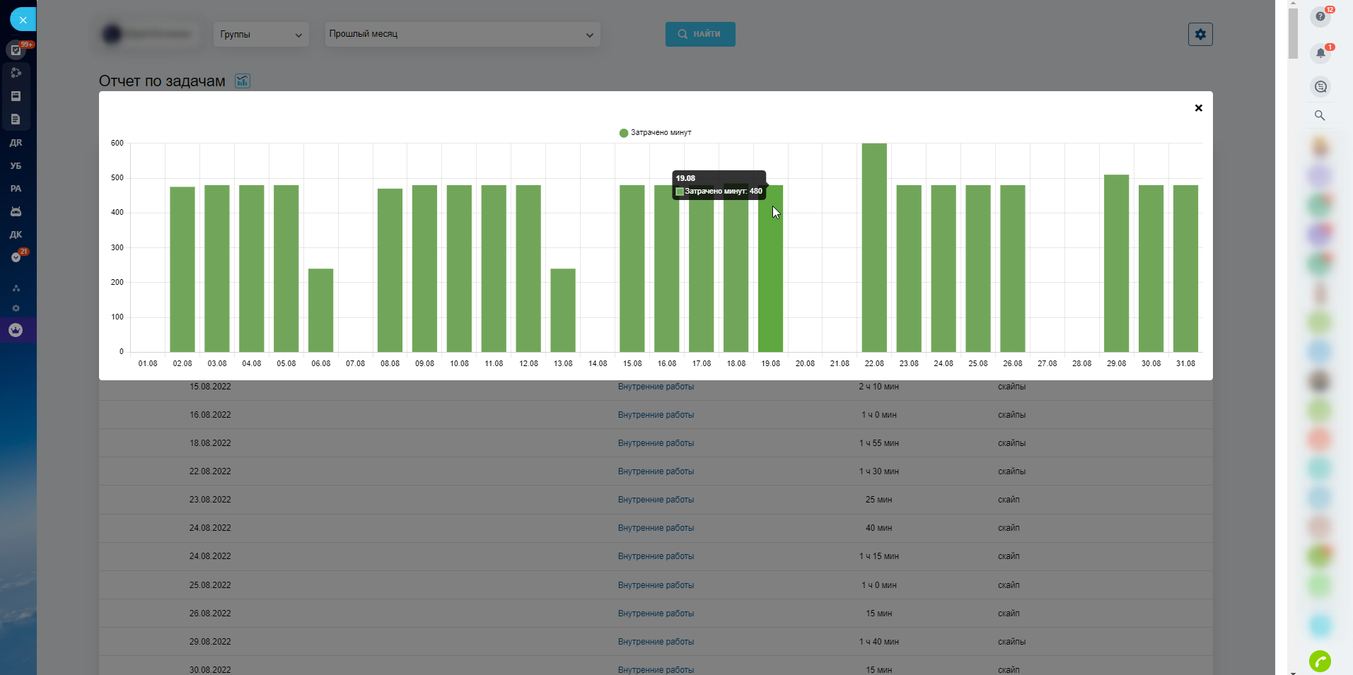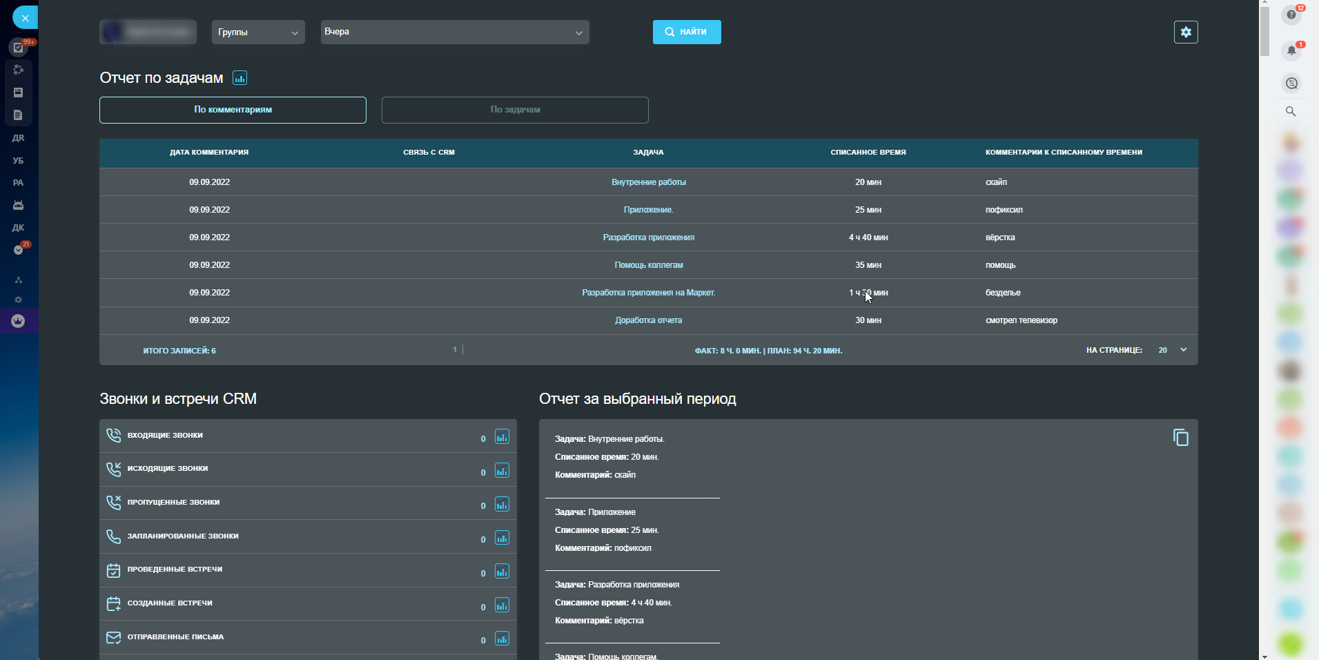 - Скопировать отчет в текст и вставить в штатный рабочий отчет, который часто требуют заполнять руководители на тарифе Компания (где используется рабочее время и рабочие отчеты).