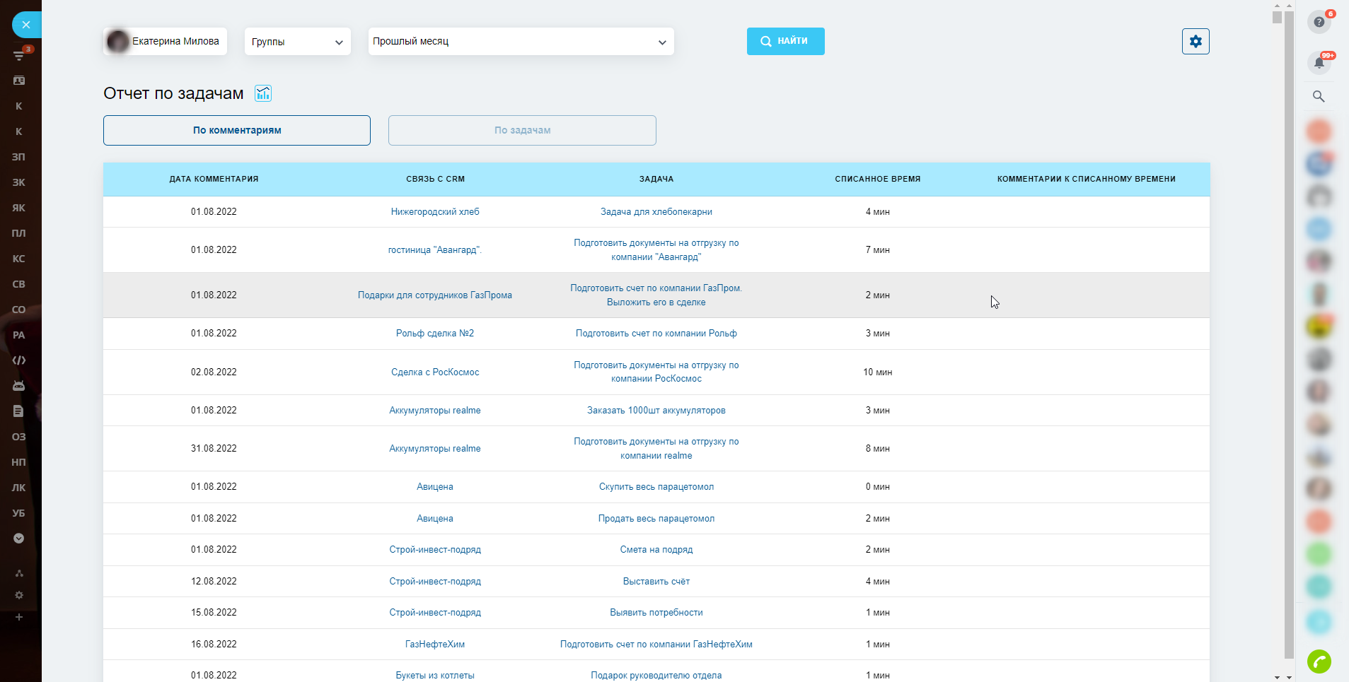 - Все задачи сотрудника за период/проект, в который было списано время с комментарием к затраченному времени;