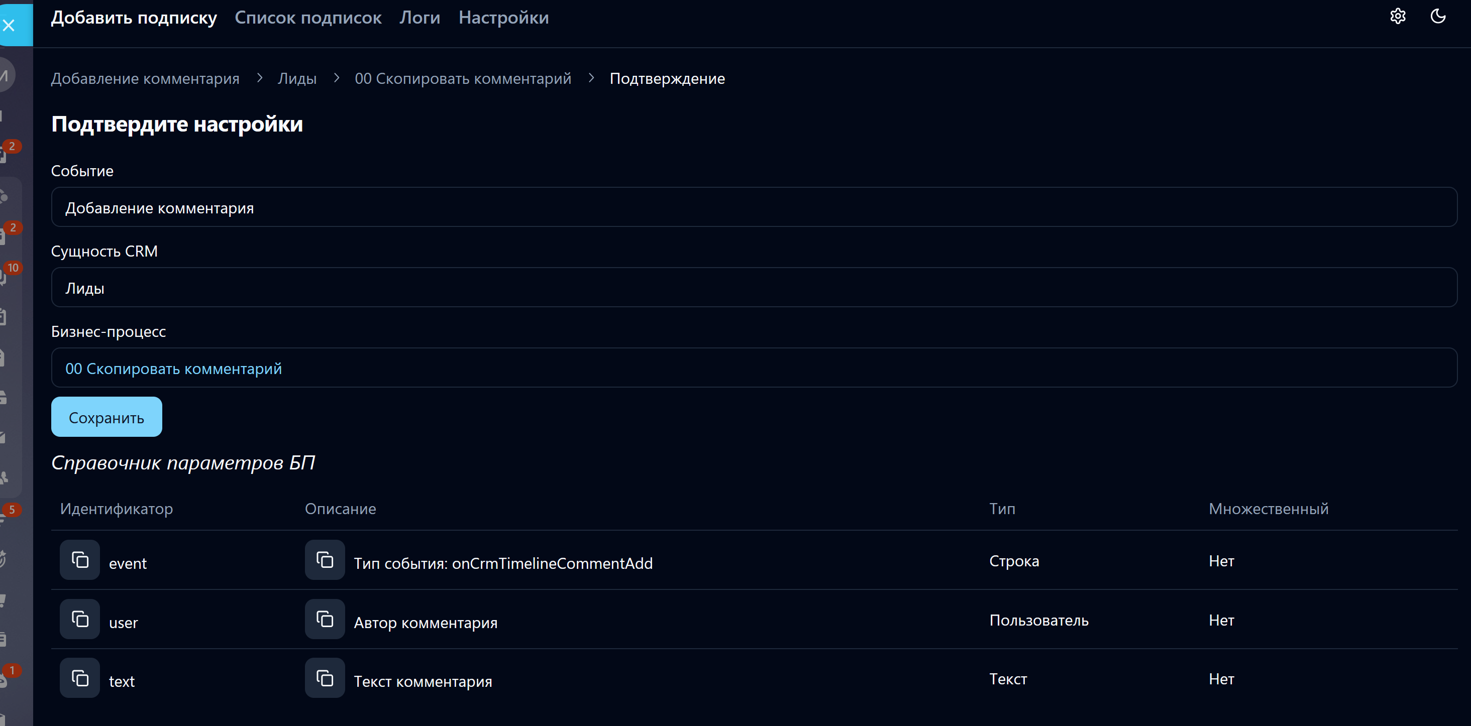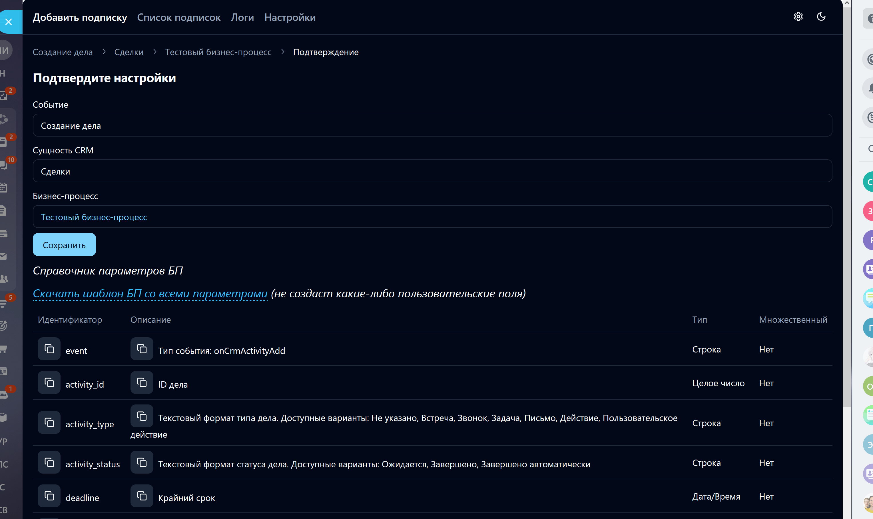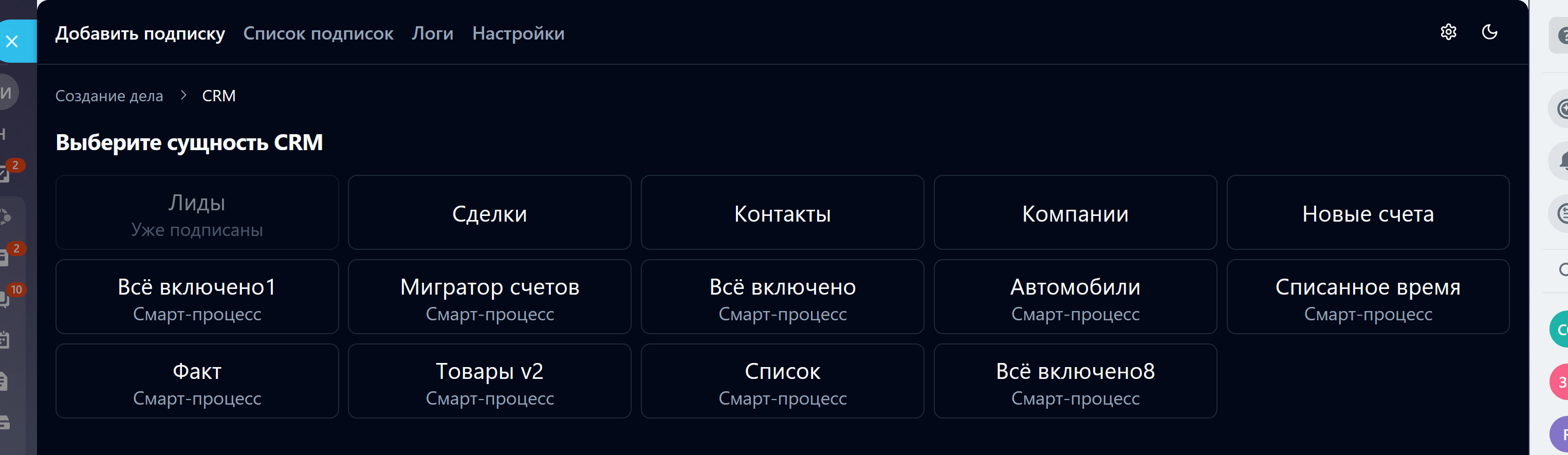 - Работает на тарифе Профессиональный и выше, так как используется модуль "Бизнес-процессы";