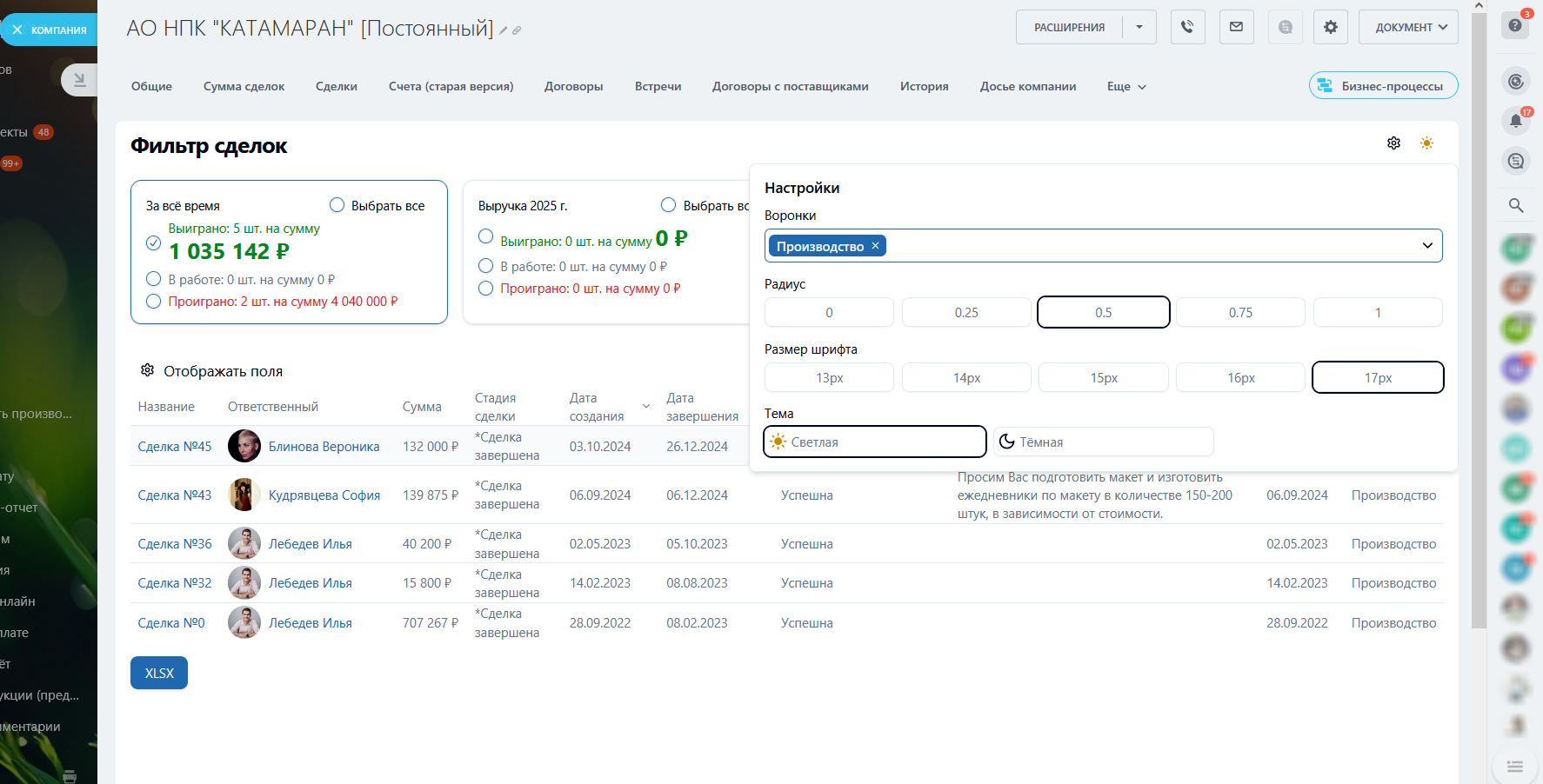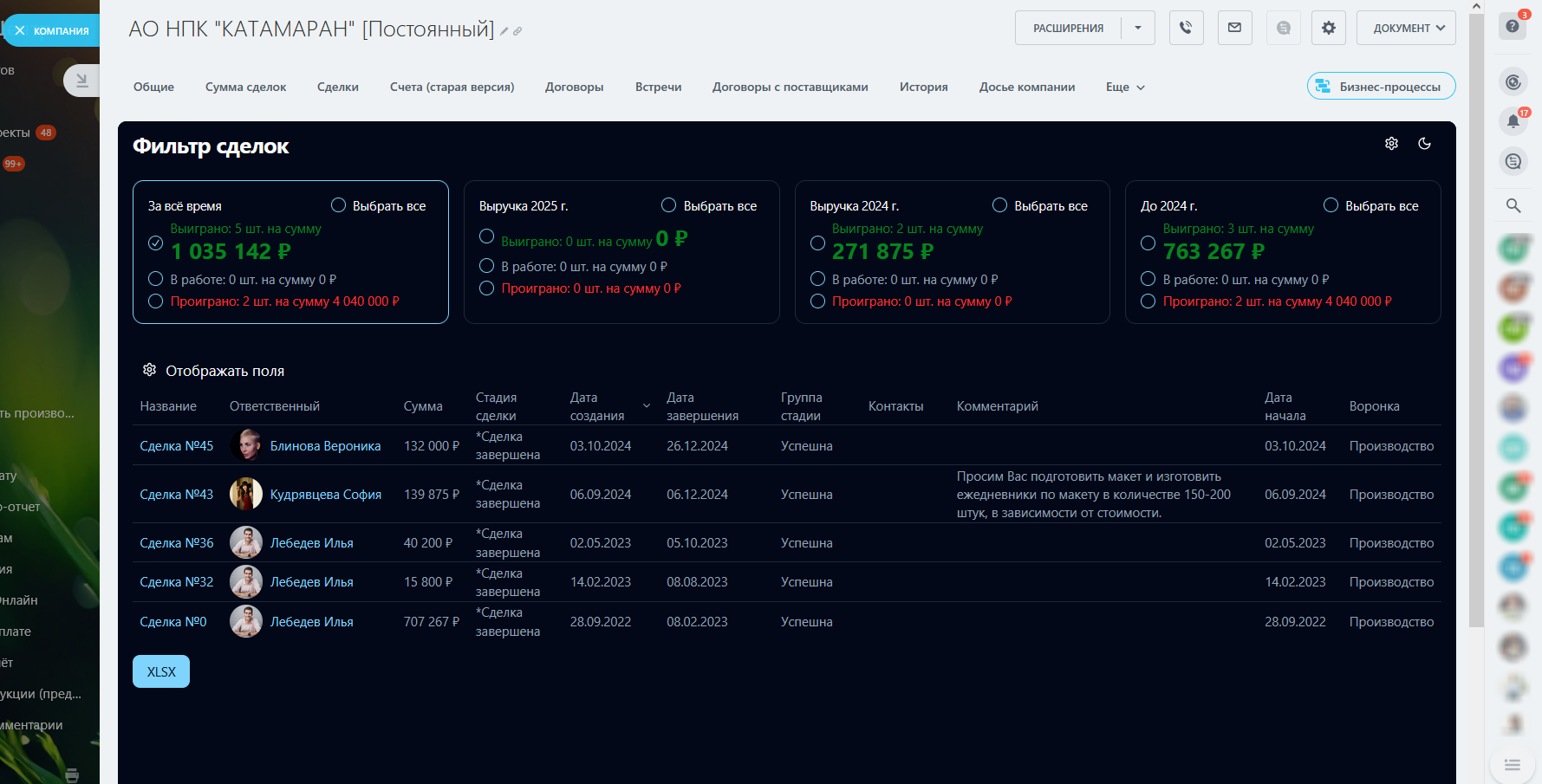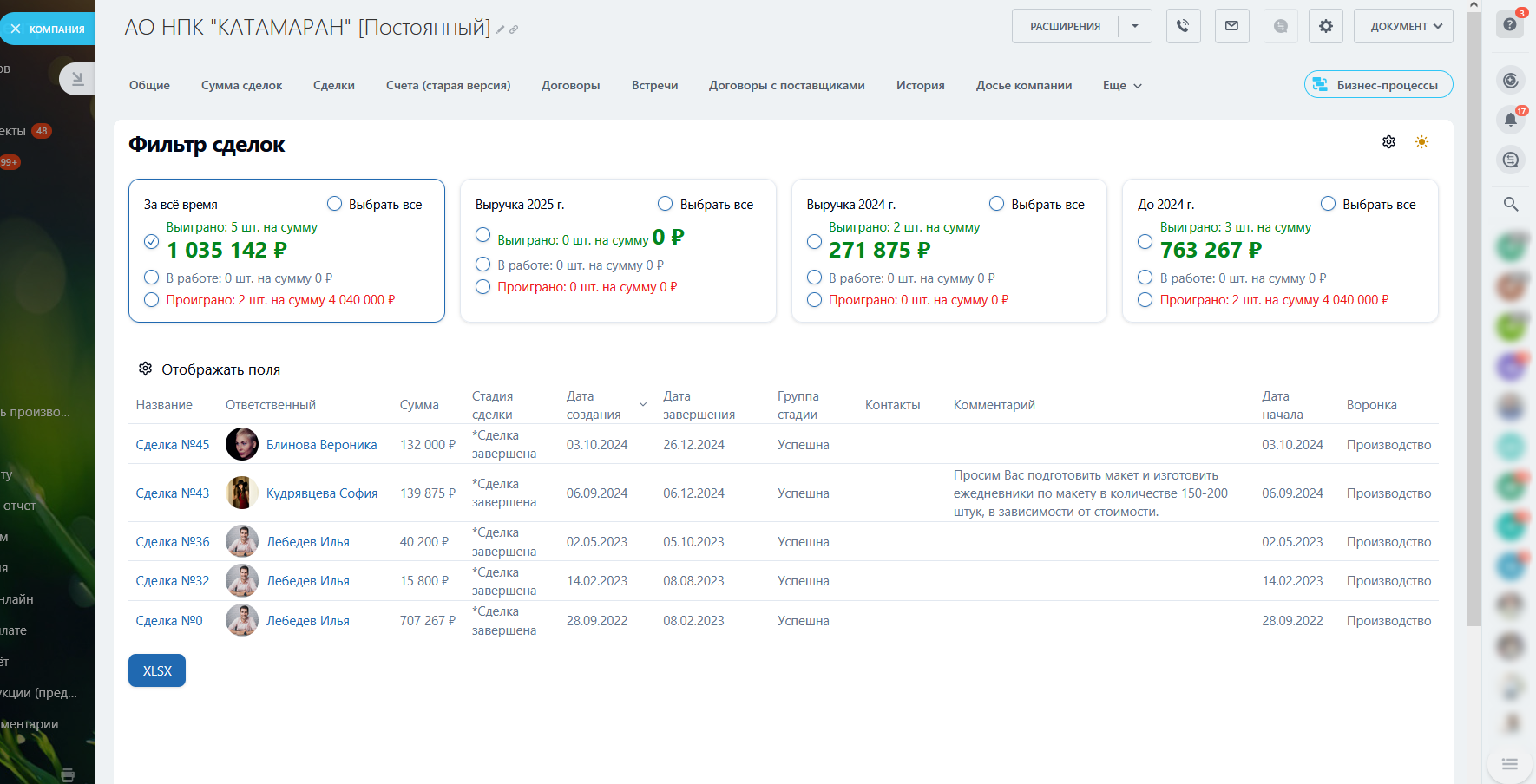 Сколько компания А принесла дохода в прошлом году? А в этом? Отчет-вкладка позволит быстро отвечать на такие вопросы, анализировать базу клиентов
