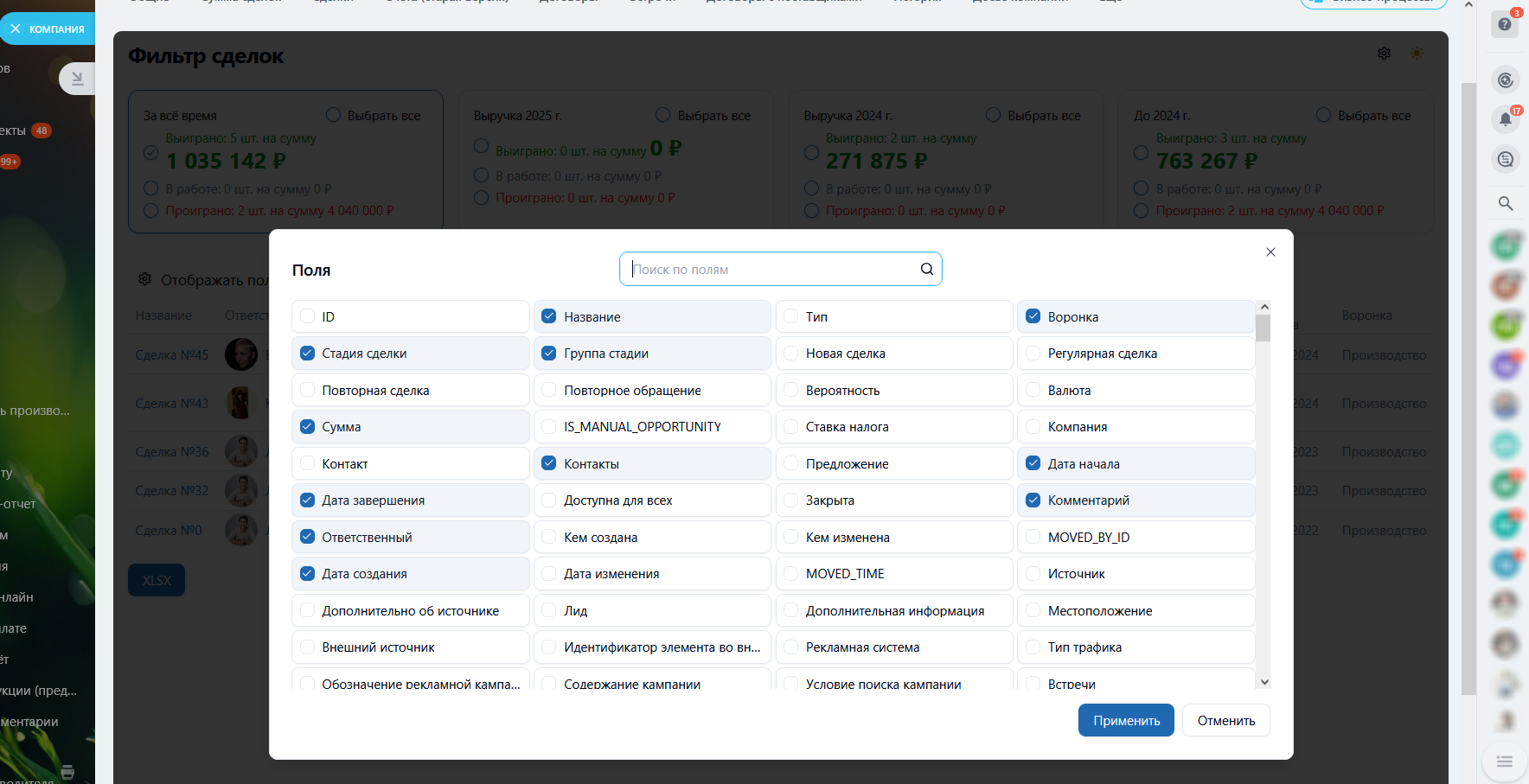 - При клике на показатель к таблице (детализации) применяется фильтр. Например, клик "В работе" во всем периоде оставит в таблице только сделки с группой стадий "В работе".