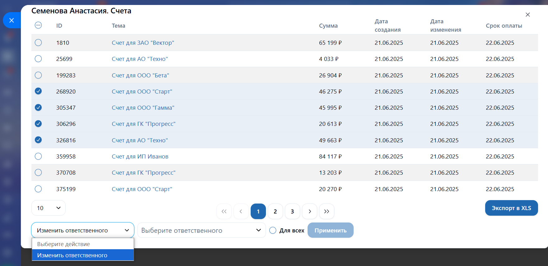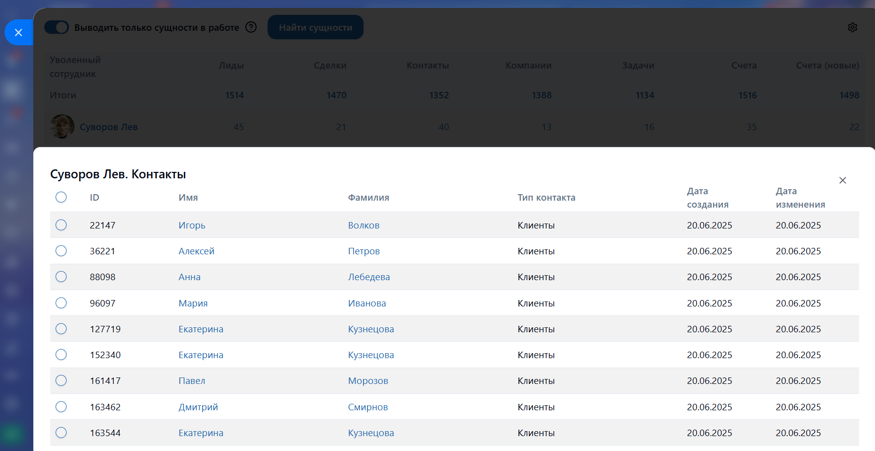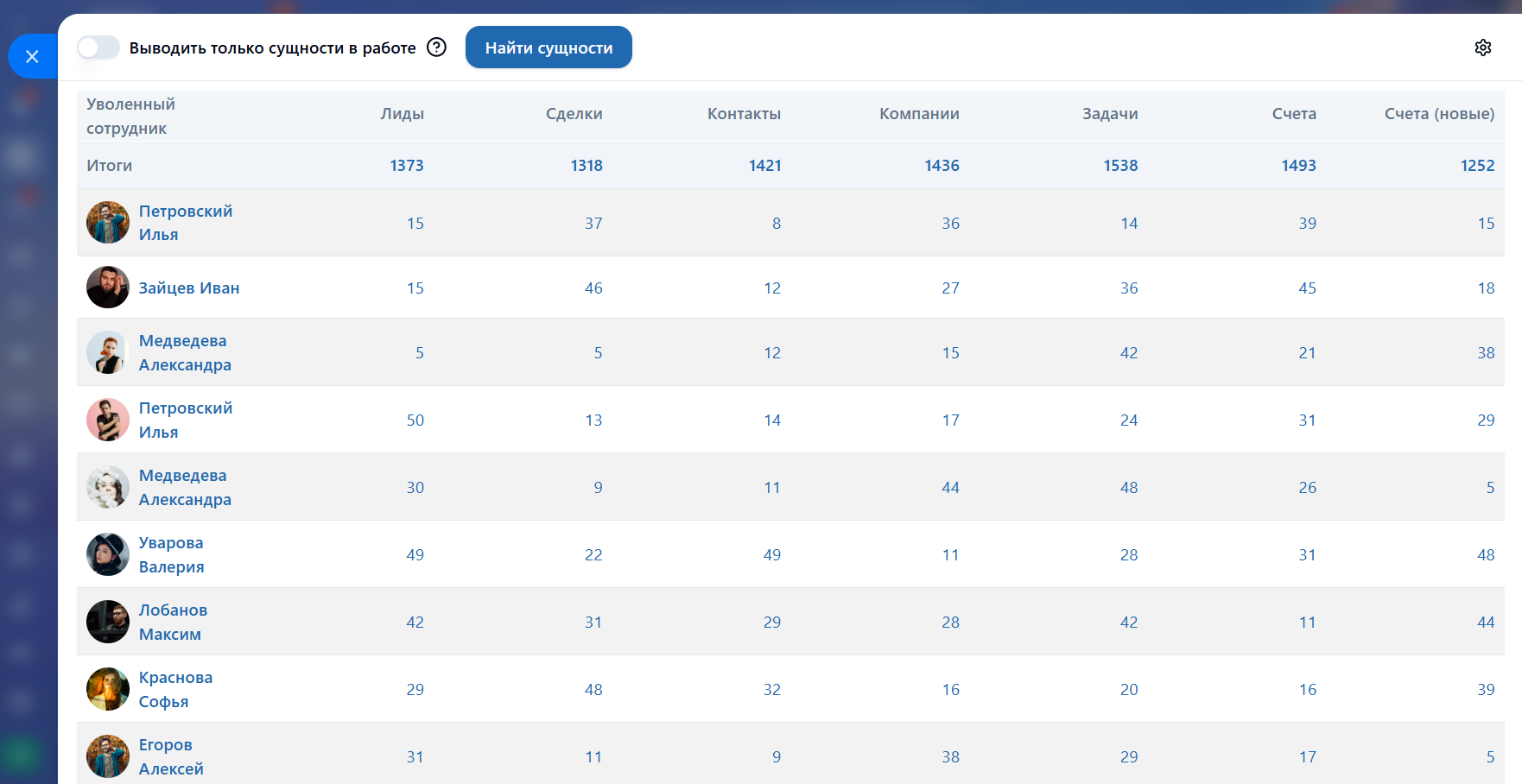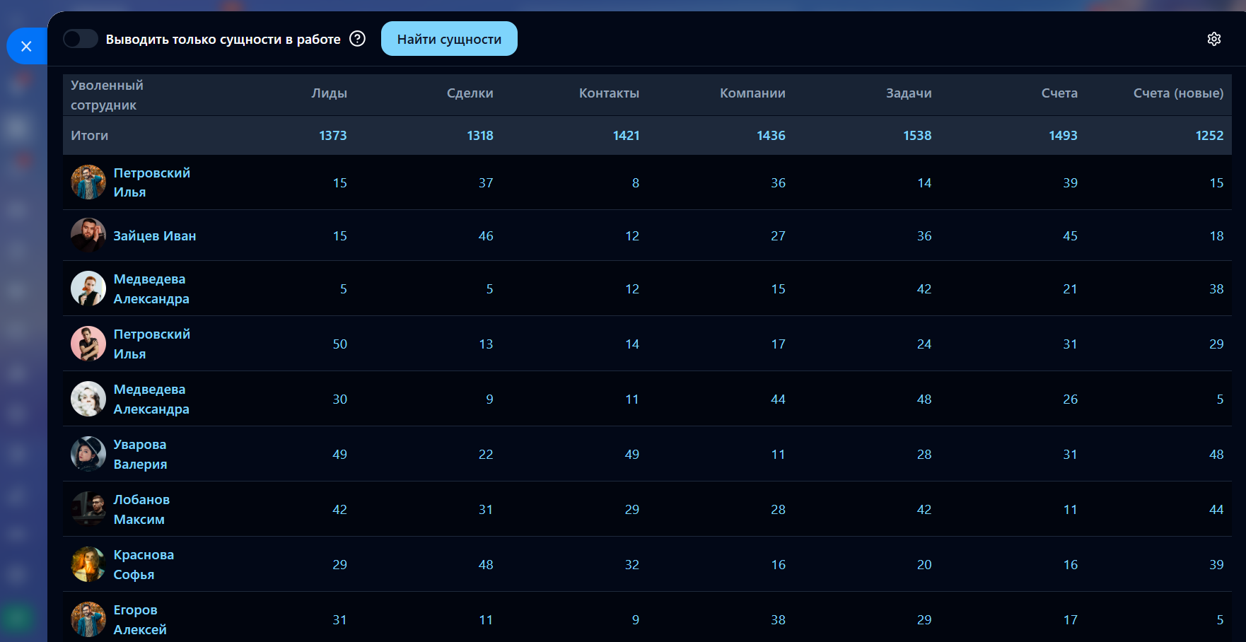 - Лиды, сделки, контакты, компании, задачи, счета (новые и старые), которые закреплены за уволенными сотрудниками;
