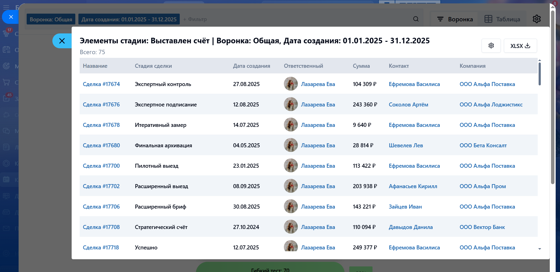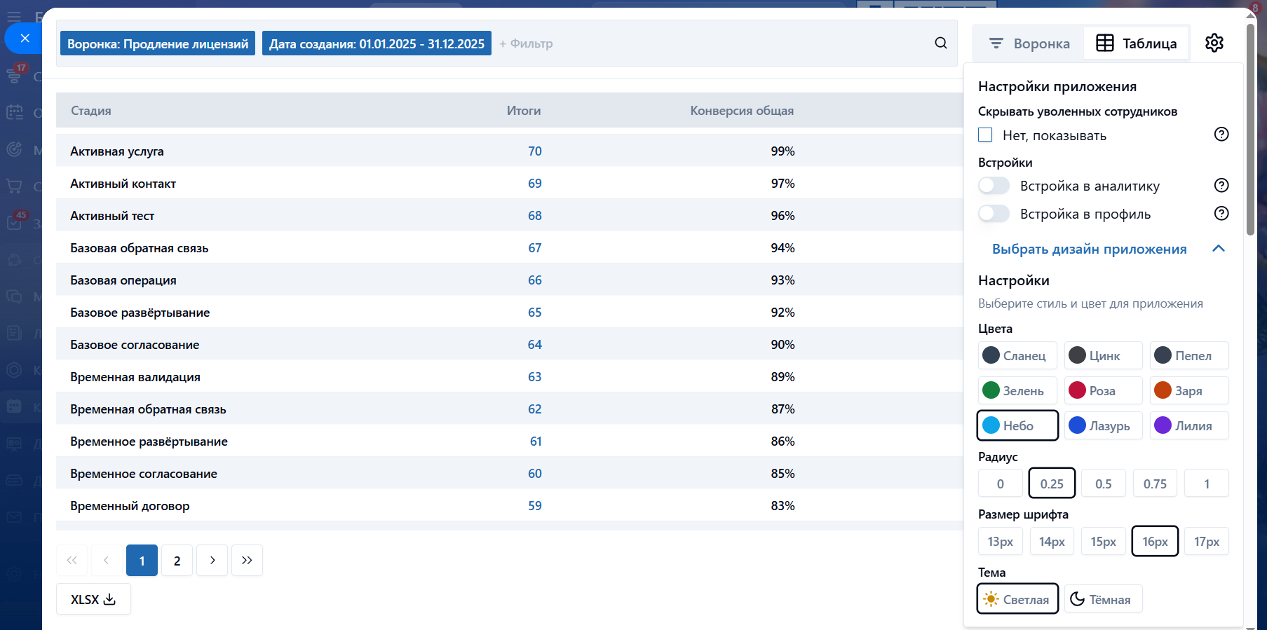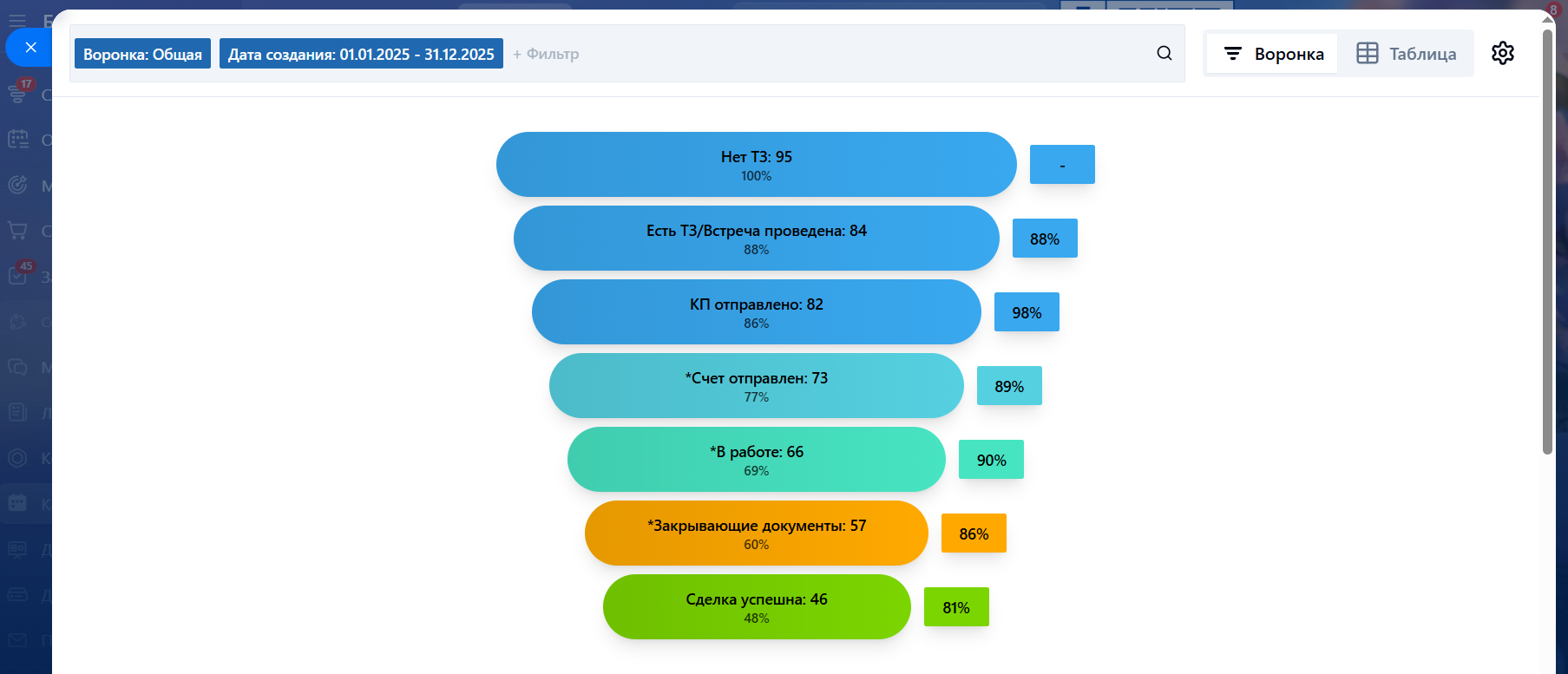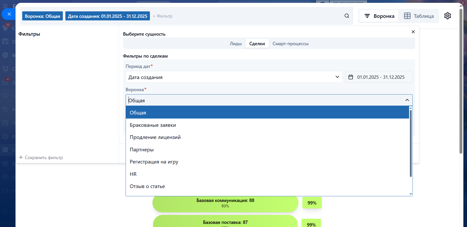 - Конверсионные воронки в сущностях: лиды, сделки, смарт-процессы;