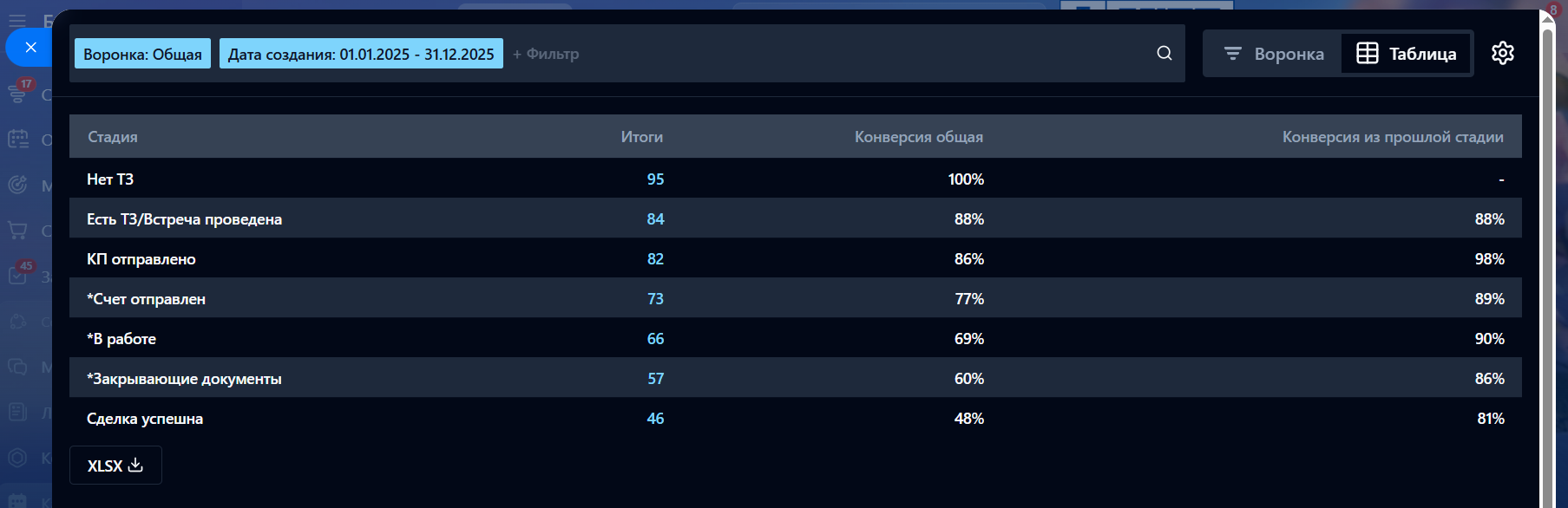 - Отслеживание общих конверсий и конверсий из прошлых стадий;