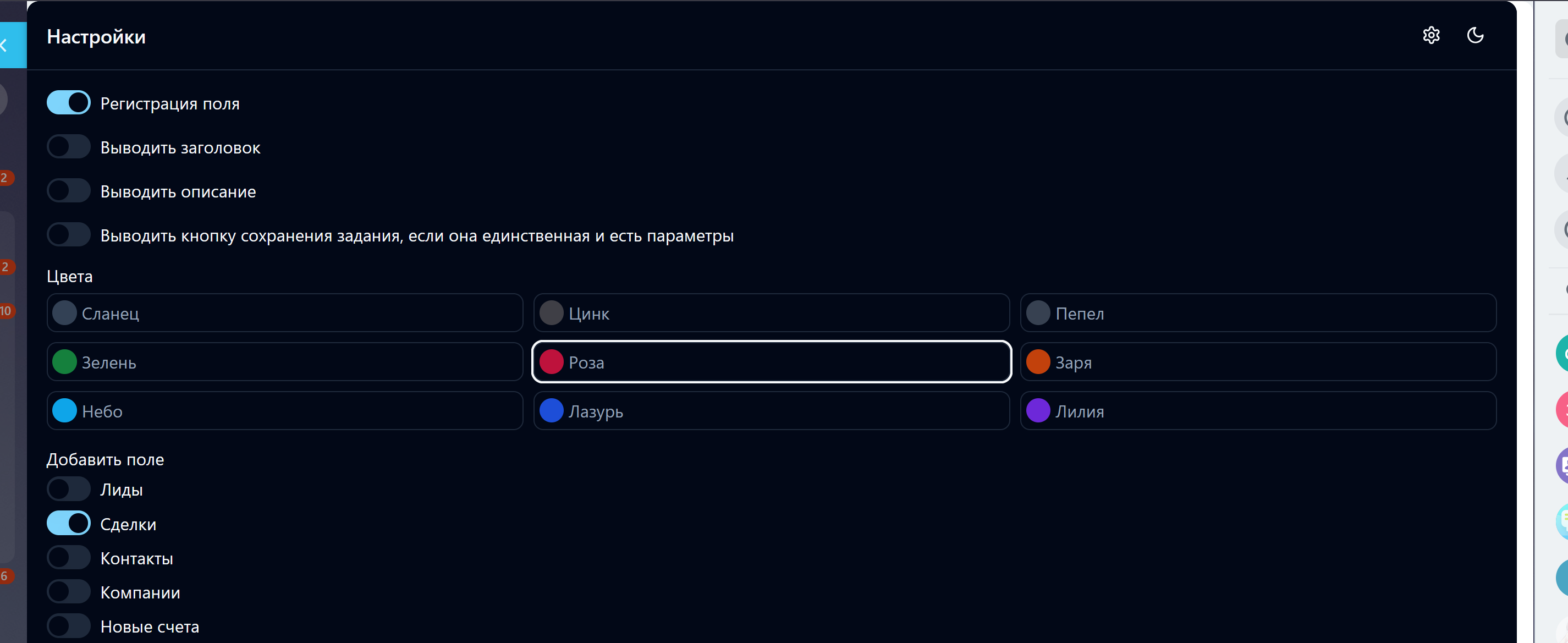 - Регистрируется поле (это делается само). Это создает новый тип поля. Но на всякий случай есть тумблер вкл/выкл в приложении (левое меню);