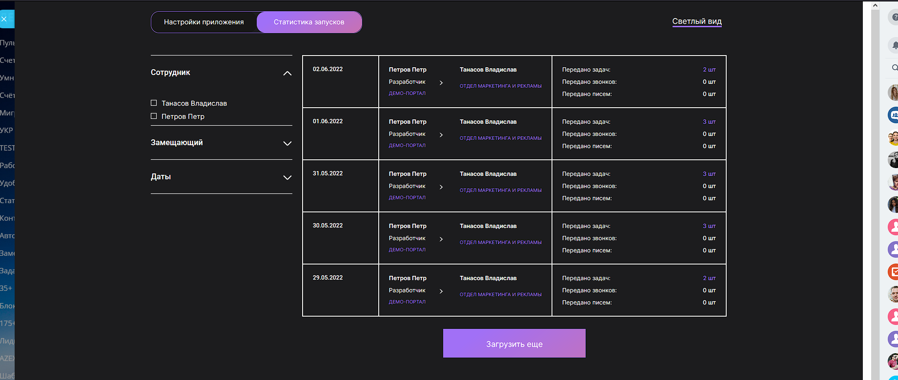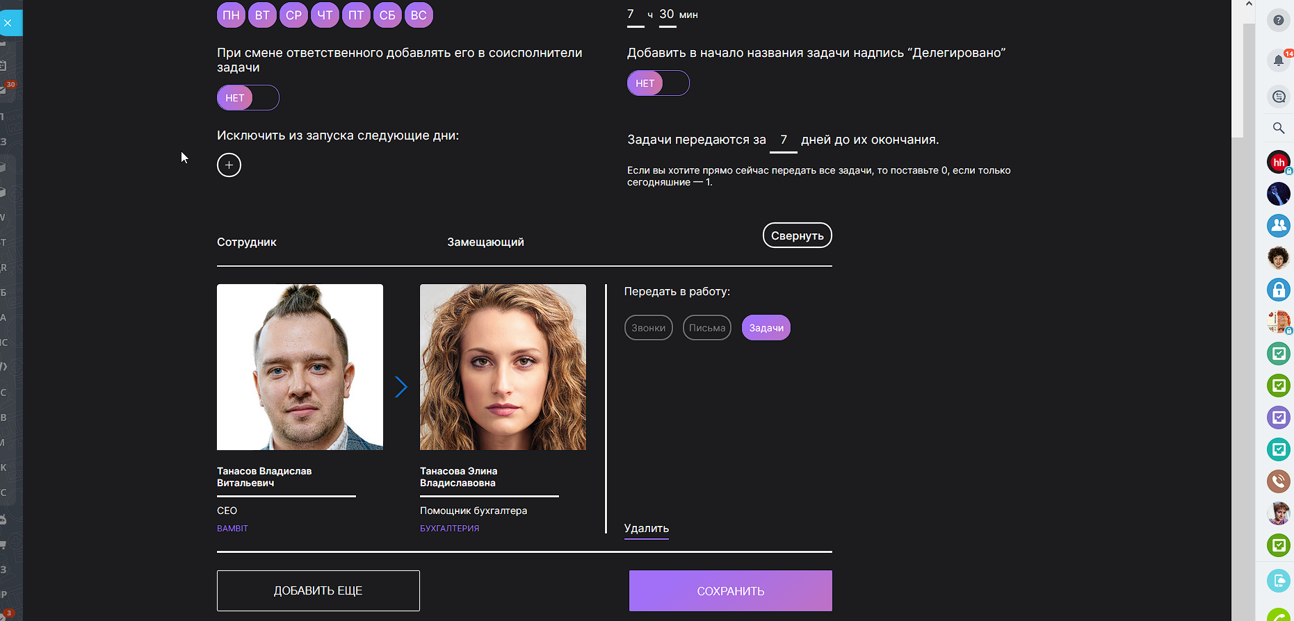 - Выбирайте с кого (сотрудник) на кого (замещающий) будут переданы: задачи, звонки (невыполненные), письма (невыполненные).