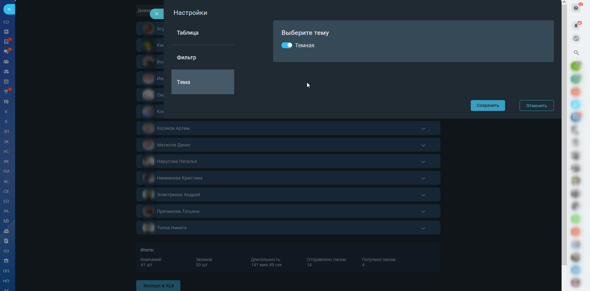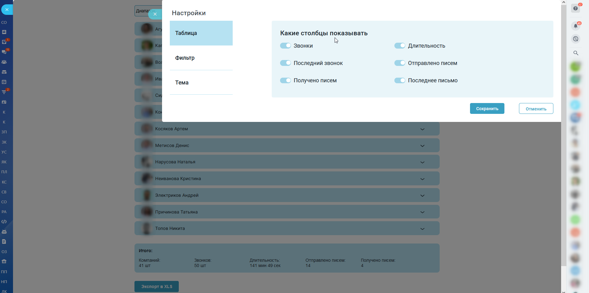 - Увидеть нагрузку звонков/писем сотрудников: сколько было звонков за период;