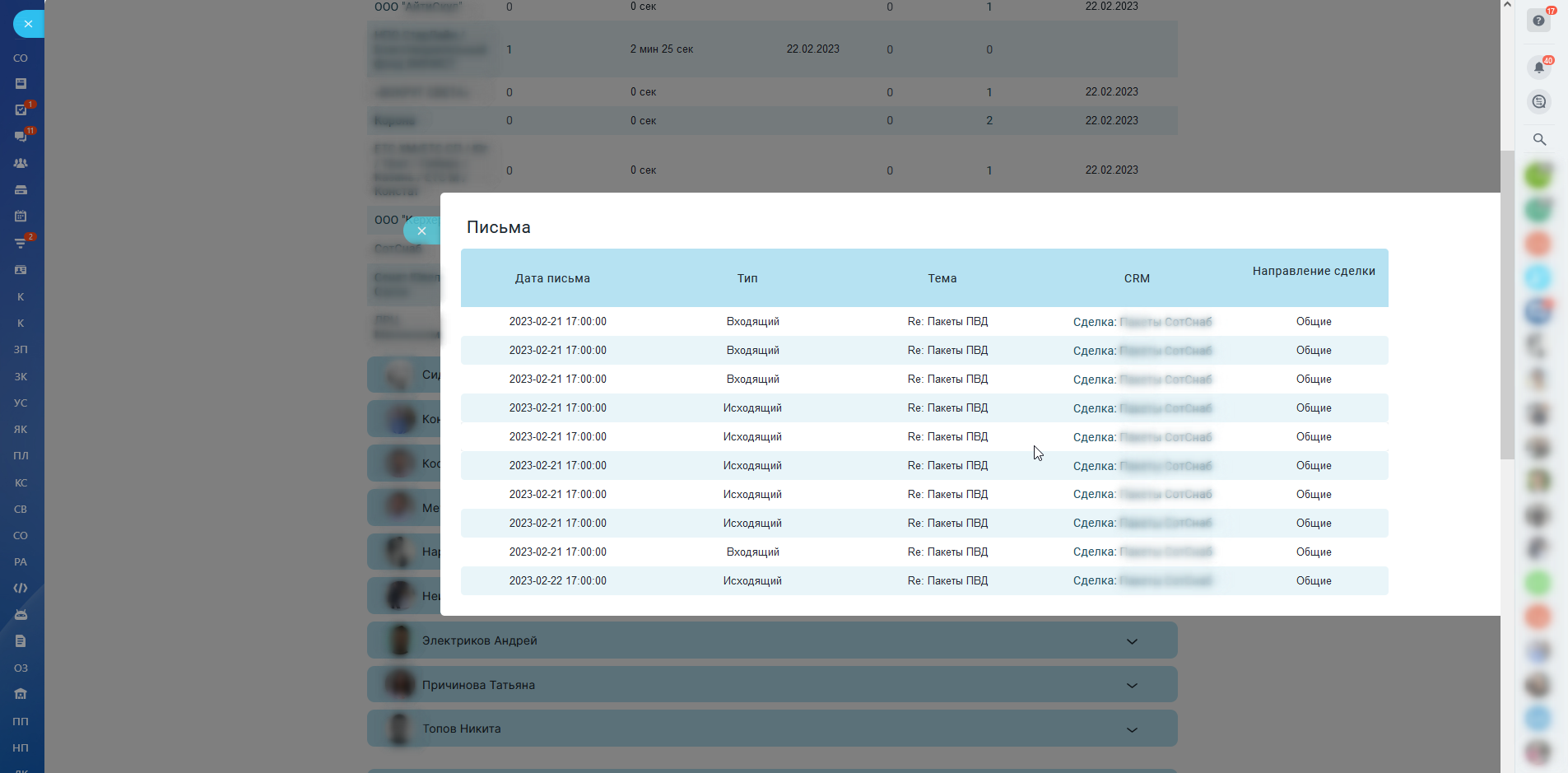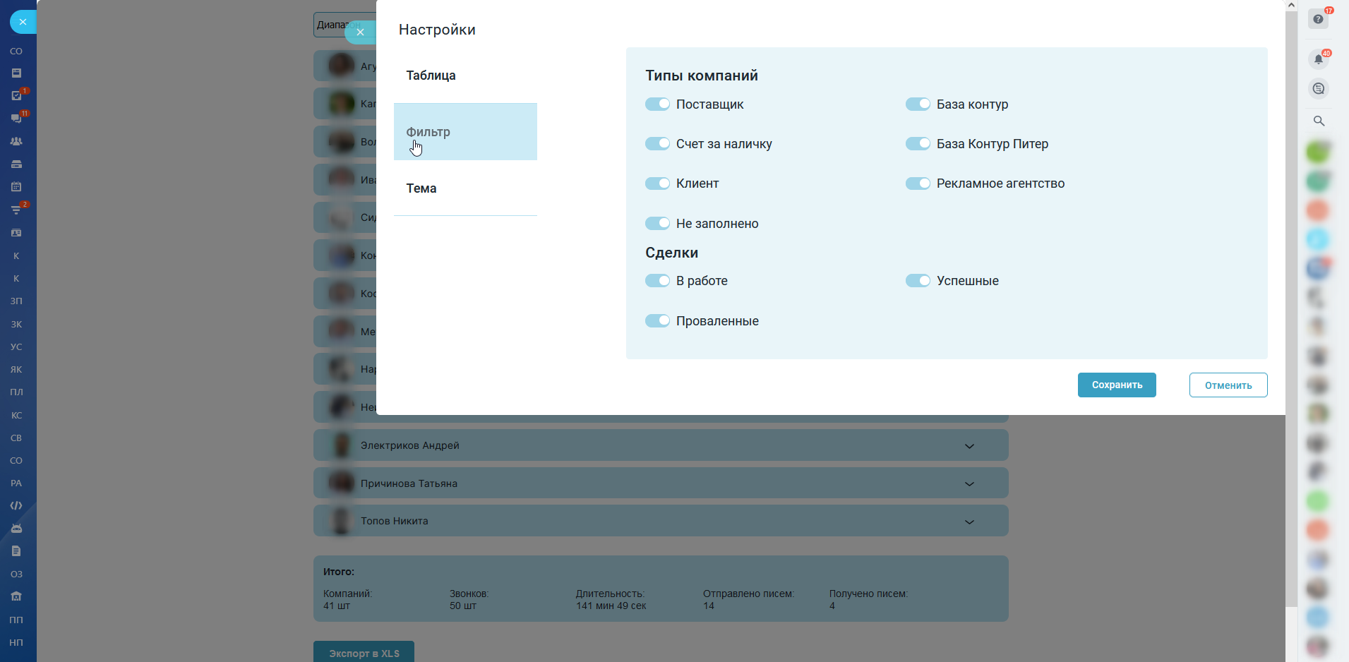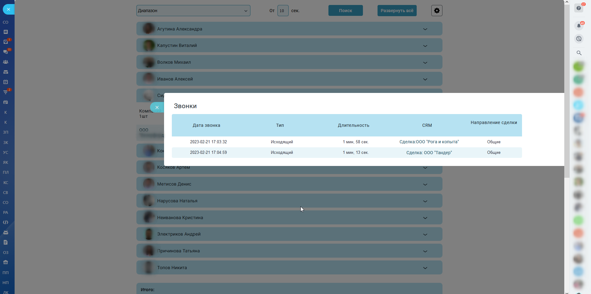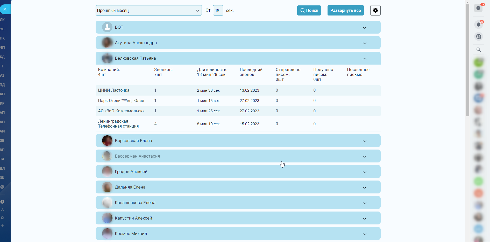 - Увидеть нагрузку звонков/писем по компаниям: сколько было звонков за период с учетом минимальной продолжительности звонка;