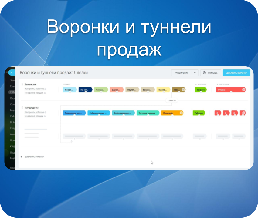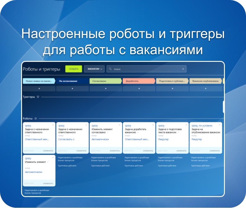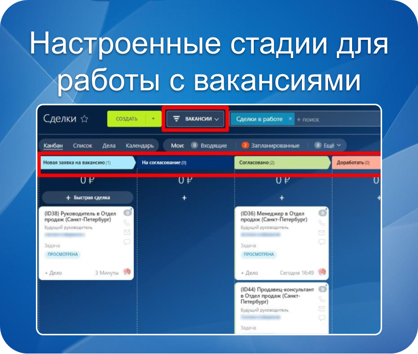 Отраслевое HR решение позволит специалистам рекрутёрам или рекрутинговым агентствам автоматизировать воронки по отбору кандидатов от начала его отклика до трудоустройства и прохождения испытательного срока. Также позволит автоматизировать работу с вакансиями.