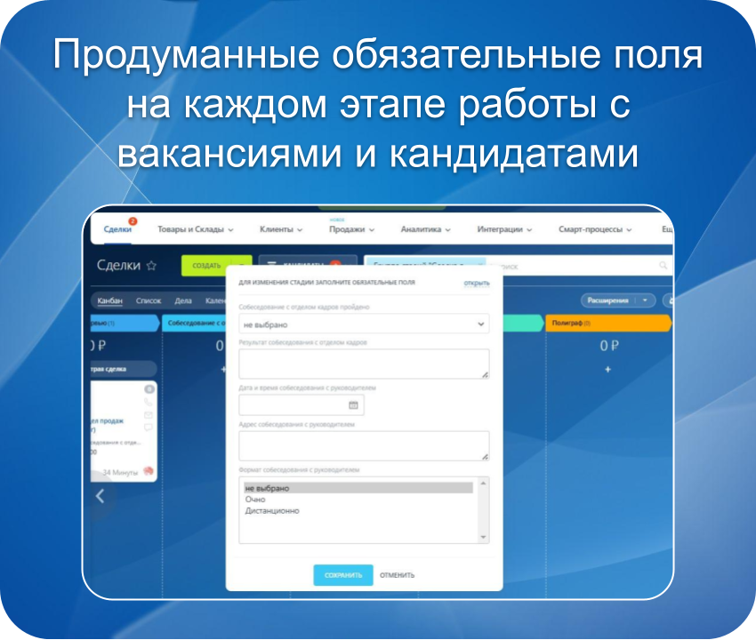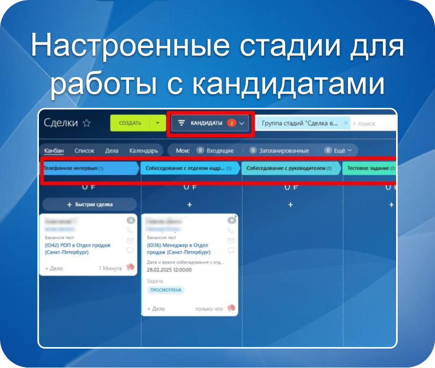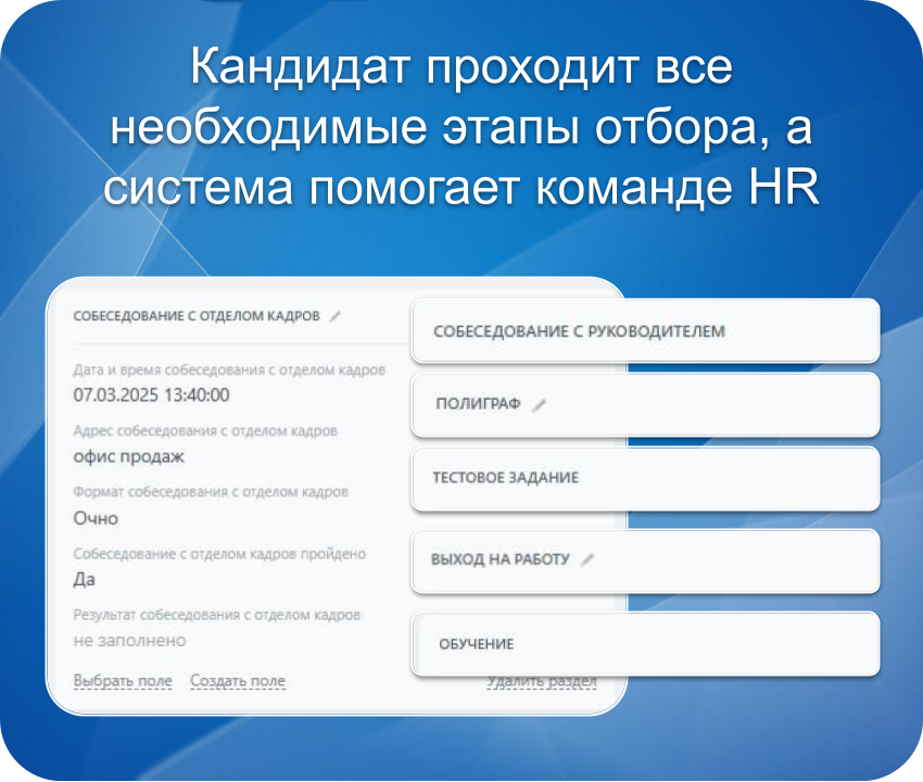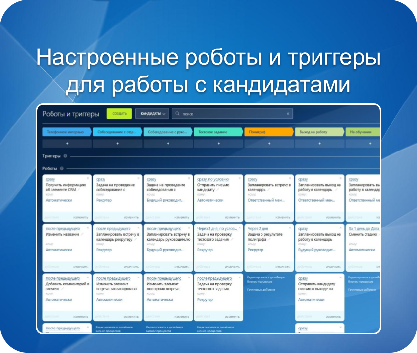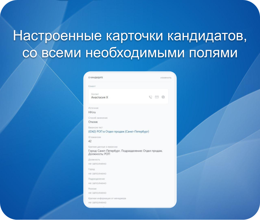 Создавайте карточку соискателя, заполняйте карточку. Взаимодействуйте с соискателем. Фиксируйте результаты интервью, собеседования, обучения. Вся история переговоров остаётся в карточке, которую мы просто передвигаем вправо.
