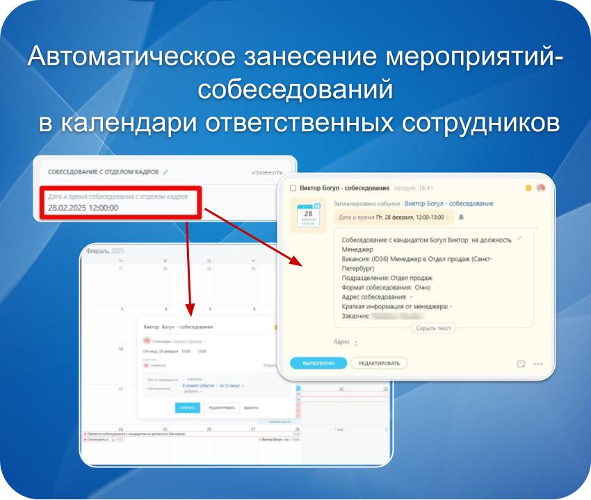 Заказчик просматривает вакансию, смотрит комментарии рекрутёра. Если кандидат подходит, назначает дату и время собеседования;
