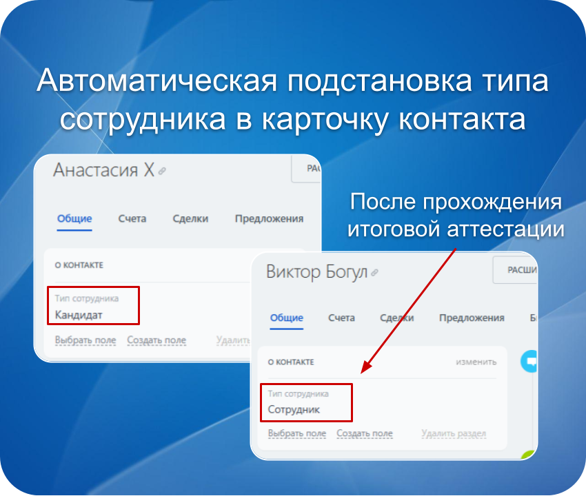 После собеседования карточку кандидата можно закрыть как не принят или перевести в стадию обучения. Указать, какое обучение необходимо пройти;