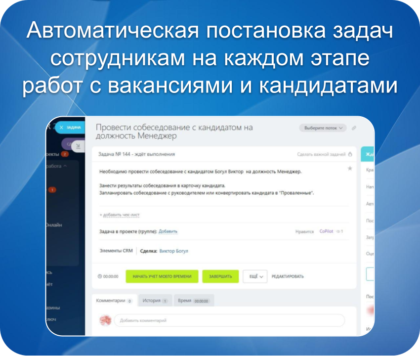 Из карточки кандидата можно запланировать и осуществить звонок, скайп, отправить письмо соискателю, поставить задачу на сотрудника.